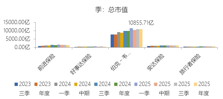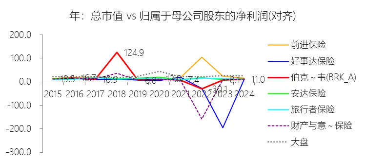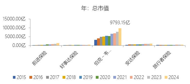 市值增长率:2025年末,伯克希尔哈撒韦-A的总市值为10855.71亿美元,对比年初增长10.85%,增速同比(去年同期)下降14.35个百分点;2015-2024年(九年)增长201.27%,年复合增长13.04%,比财产与意外伤害保险行业的复合增速高0.6个百分点,长期呈下降趋势。增速短期下降主要由于2025年伯克希尔哈撒韦的经营利润与净利润均出现同比下滑,其中净利润因计入利润表的投资收益(含未实现公允价值变动)规模收缩,以及对卡夫亨氏和西方石油计提了总计82.55亿美元的巨额资产减值准备,导致同比大幅下降24.9%。此外,尽管公司股价在2025年上涨了10.9%,但未能延续2024年25.5%的高增长态势,且在当年的市场表现中逊于上涨17.9%的标准普尔500指数,反映出在宏观经济波动及公司业绩承压的背景下,投资者对超大型蓝筹股的估值扩张趋于谨慎。增速长期下降主要由于“复利数大”的数学客观制约日益凸显,伯克希尔已拥有超过7000亿美元的股东权益,成为全美GAAP净资产规模最大的企业。管理层多次在报告中强调,随着资本基数的极度扩张,在当前市场环境下能够对整体业绩产生显著拉动作用(“拨动秤砣”)的大型优质收购目标寥寥无几,这种由于体量巨大而导致的增长边际递减是不可避免的长期趋势。增速高于财产与意外伤害保险行业的复合增速主要由于伯克希尔并非单一业务的保险商,而是一个由保险、铁路、能源及广泛实业组成的多元化控股巨头,其横跨多个行业的“Niagara”般的海量利润来源有效对冲了保险行业的周期波动风险。依靠独特的保险浮存金模式,公司能够获取极低成本甚至负成本的庞大资金进行长期投资,并执行远超传统保险同行债券配置比例的“重权益、重实业”策略,通过持有如苹果、美交等核心股权资产的长期价值增长,以及铁路(BNSF)和能源(BHE)等高门槛基础设施资产的稳健现金流回报,实现了比业务结构单一、投资手段受限的传统保险机构更卓越的资本复利效果。