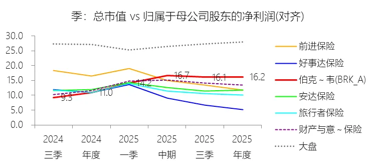 市盈率:2025年,伯克希尔哈撒韦-A的归属于母公司股东的净利润(对齐)为669.68亿美元,对比年初减少24.75%,总市值与归属于母公司股东的净利润(对齐)的比例为16.2倍(市盈率),对比年初上升5.21个倍数;2015-2024年(十年),此项合计为4734.52亿美元,平均比例为12.5倍,比财产与意外伤害保险行业的均值低0.59个倍数,长期呈下降趋势。比例短期上升主要由于2025年伯克希尔哈撒韦归属于母公司股东的净利润(对齐)同比大幅减少24.75%至669.68亿美元,而同期公司股价上涨带动总市值增长了10.85%至10855.71亿美元,这种分母(盈利)显著收缩与分子(市值)持续扩张的非对称表现,直接推高了市盈率倍数。净利润的下滑主要受到投资端的多重打击:一是计入利润表的投资损益(含未实现公允价值变动)受市场波动影响较去年减少了25.99%,其中期末持股的税前未实现盈利规模收缩;二是同年对卡夫亨氏和西方石油计提了总计82.55亿美元的非暂时性减值损失;三是非美元债务由去年的汇兑收益转为损失,且保险投资收益受利率下行影响而缩减。比例长期下降主要由于自2018年起执行的新会计准则(ASU 2016-01)要求将庞大股权证券组合的未实现公允价值变动直接计入净利润,这在过去十年的市场扩张周期中显著抬高了账面盈利基数,使得计算出的市盈率在数值上被动走低。同时,随着公司股东权益扩张至超过7000亿美元,受“复利数大”规律的数学制约,能够显著拉动业绩的大型优质收购目标日益稀缺,市场对其长期增长预期由早期的爆发式转向稳健扩张,估值溢价随之进行理性修正。比例低于财产与意外伤害保险行业的均值主要由于伯克希尔独特的多元化业务结构,其庞大的实业板块(如BNSF铁路、BHE能源及各类制造零售业)贡献了超过一半的营业利润,这些行业在资本市场上的估值乘数通常低于具有高杠杆获利弹性的纯保险金融企业。此外,公司长期在资产端持有超过3600亿美元的超额现金及短期美债,这种“金融堡垒”式的资产配置虽然保障了极高的安全性,但由于现金资产的回报率远低于权益投资,在牛市环境中会对整体市盈率产生明显的压制效应。同时,由于其净利润包含了受股市波动影响剧烈的投资未实现损益,这种非经营性的盈余波动常导致分母(盈利)在市场向好时非对称性放大,从而使伯克希尔的市盈率在统计上逊色于业务集中、营收口径较小的传统财产险同行。