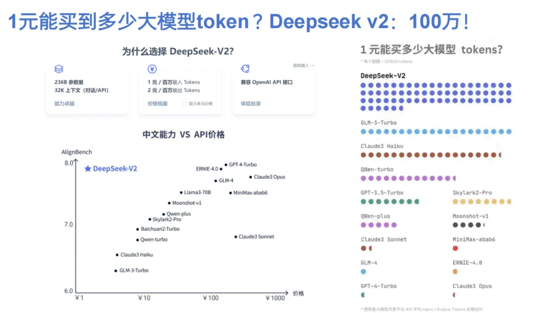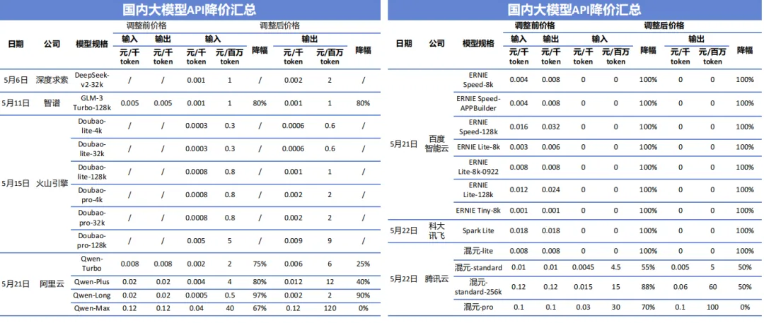 2024年5月国产大模型价格战全面开打,DeepSeek-V2以1元/百万输入Tokens、2 元/百万输出Tokens创下低价纪录,阿里云Qwen-Long输入降幅达97%,百度、腾讯等大厂多款入门级模型甚至免费开放。