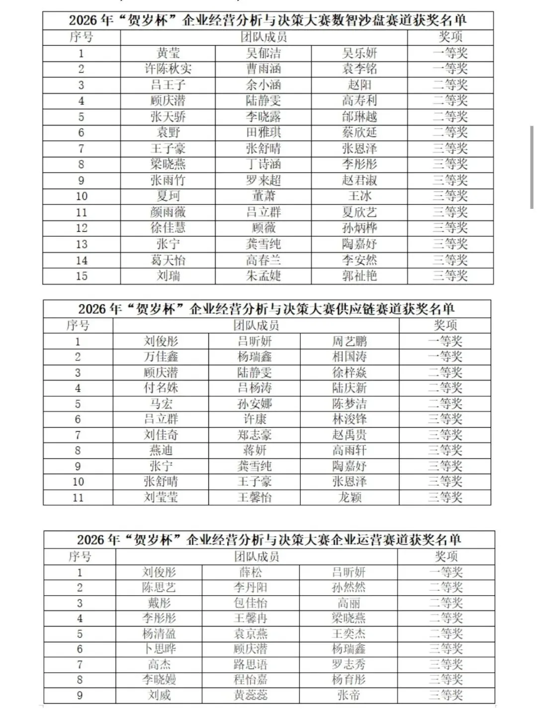 近日,由中国管理现代化研究会指导,中国管理现代化研究会决策模拟专业委员会主办的2026年“贺岁杯”企业经营分析与决策大赛落下帷幕,我院学子再创佳绩,于企业运营赛道荣获全国一等奖1项,二等奖4项,三等奖4项;于数智沙盘赛道荣获全国一等奖2项,二等奖4项,三等奖9项;于供应链决策赛道荣获全国一等奖2项,二等奖3项,三等奖6项。