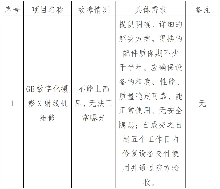 为了保证影像科业务正常运转,需要对影像科数字化摄影X射线机(DR)(品牌:GE、型号:Optima XR646 HD)的故障维修项目开展市场调研,后续采购部门跟进调研询价情况开展采购服务。诚邀具备资质和能力的厂家及三方维修商参加。