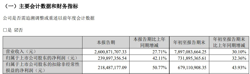单季度来看,第三季度营收26亿元、净利润2.4亿元、扣非净利润2.18亿元,分别同比增长27.71%、42.11%、50.77%,增长态势良好。
