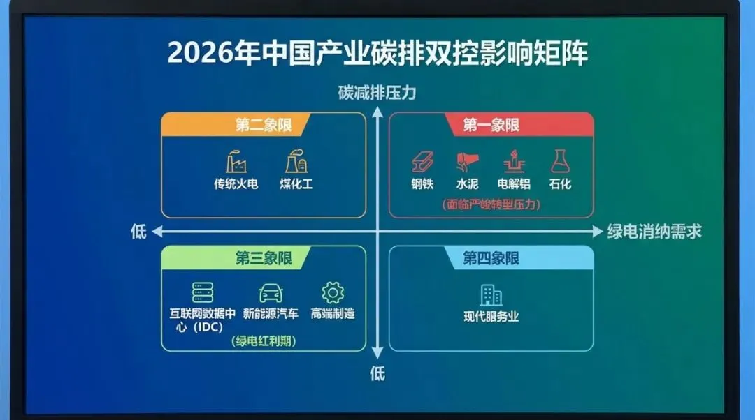 IDC与高新产业:它们对电力极其渴望,但由于碳排双控对绿电的豁免,这些行业可以通过“逐绿而居”——将厂房和机房搬迁到西北等绿电丰富地区,绕过碳排限制,实现无限规模扩张。 出海溢价:2026年恰逢欧盟碳关税(CBAM)正式实施。具备完善碳核算体系和低碳足迹的中国高端制造业,将通过国内的政策磨炼,在国际市场上建立起极强的“绿色贸易壁垒”免疫力,甚至获得反超海外竞争对手的机会。