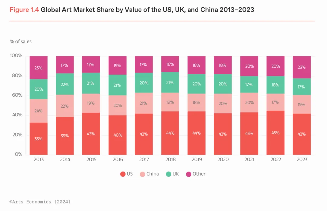 2023年,中国取代英国,成为全球第二大艺术品市场,份额上升至19%。美国依然保持艺术市场成交额第一,占比42%;英国市场2023年全年成交额占全球市场成交额的17%,是全球第三大艺术交易市场。
