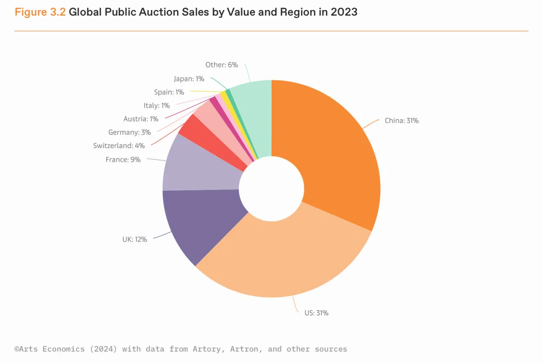 中国的拍卖市场方面,由于大部分拍卖公司选择将2022年的秋拍延期在2023年举行,这也导致2023年的中国艺术品拍卖市场增长跃升为与美国持平的水平,各占全球公开拍卖成交额(不包括私人销售)的31%的份额;英国与法国位列第三、第四,分别占比12%、9%。