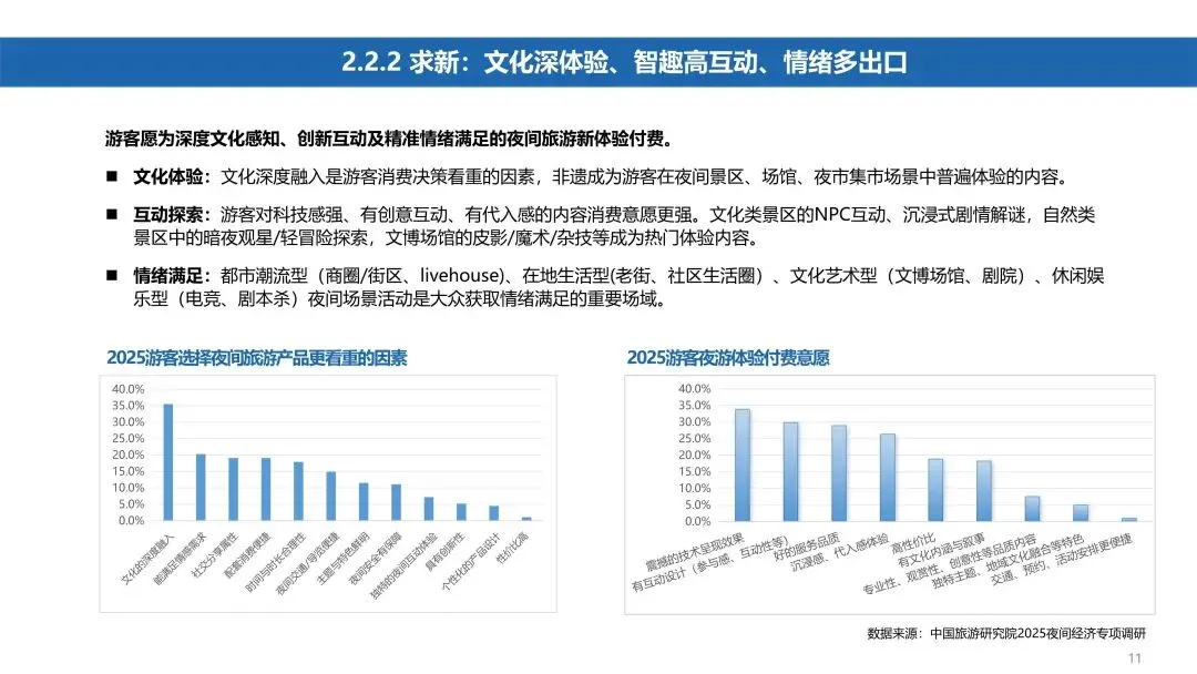 一、2025年夜间经济关键数据景区夜间开放情况:5A级景区夜间开放率达66.9%,较往年趋于稳定。47.5%的夜间开放景区实现“食住行游购娱”全业态覆盖,系统性构建夜间消费生态。一级博物馆夜间开放率在暑期、假日升至37.6%,受“博物馆奇妙夜”活动推动。消费趋势:需求侧呈现“多元、求新、社交”特征,消费者追求沉浸式体验与情感联结。供给侧加速升级,通过科技赋能和业态融合响应需求。
