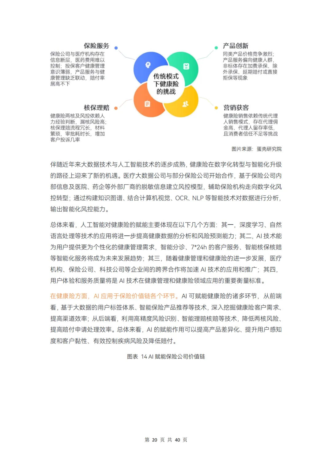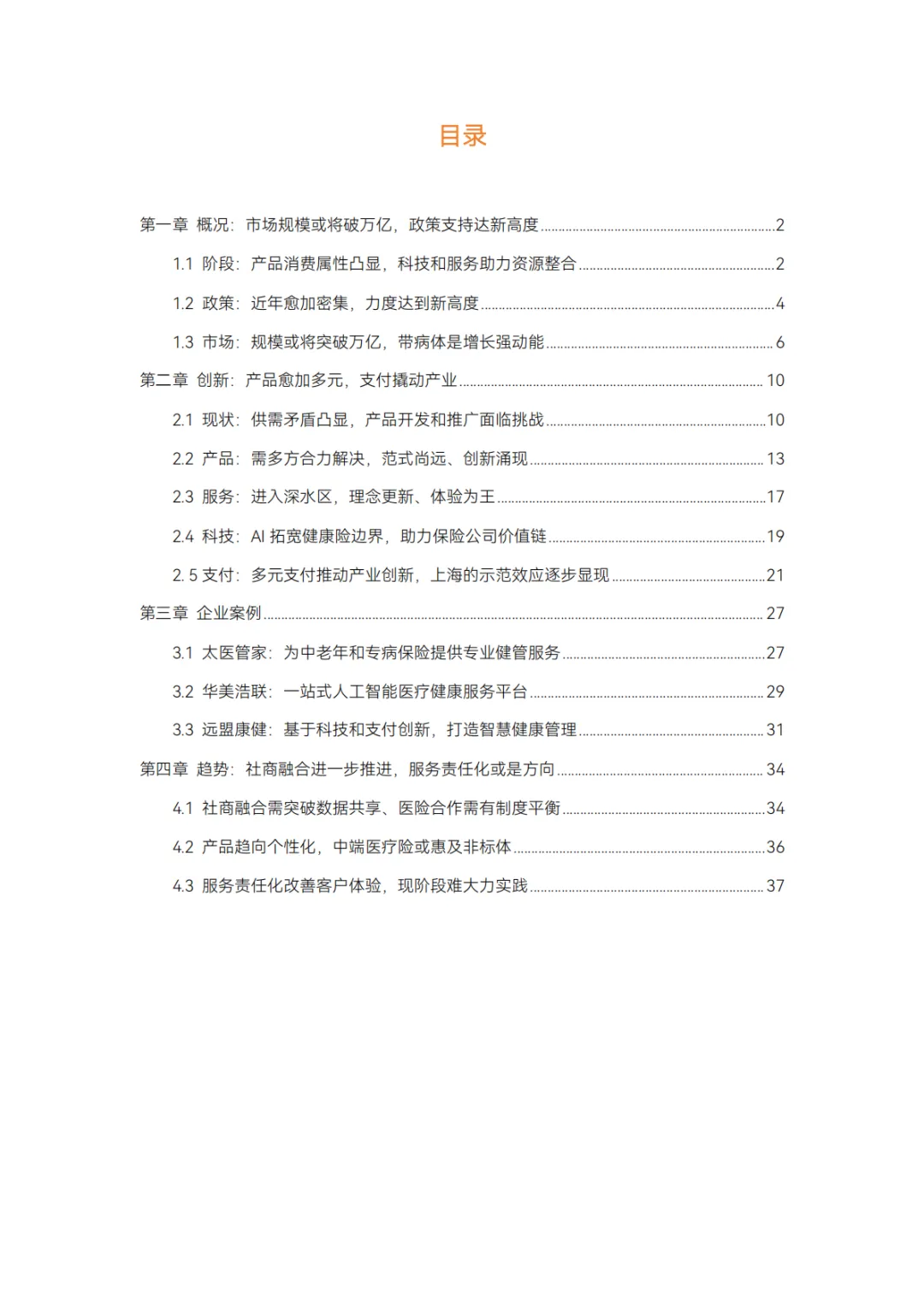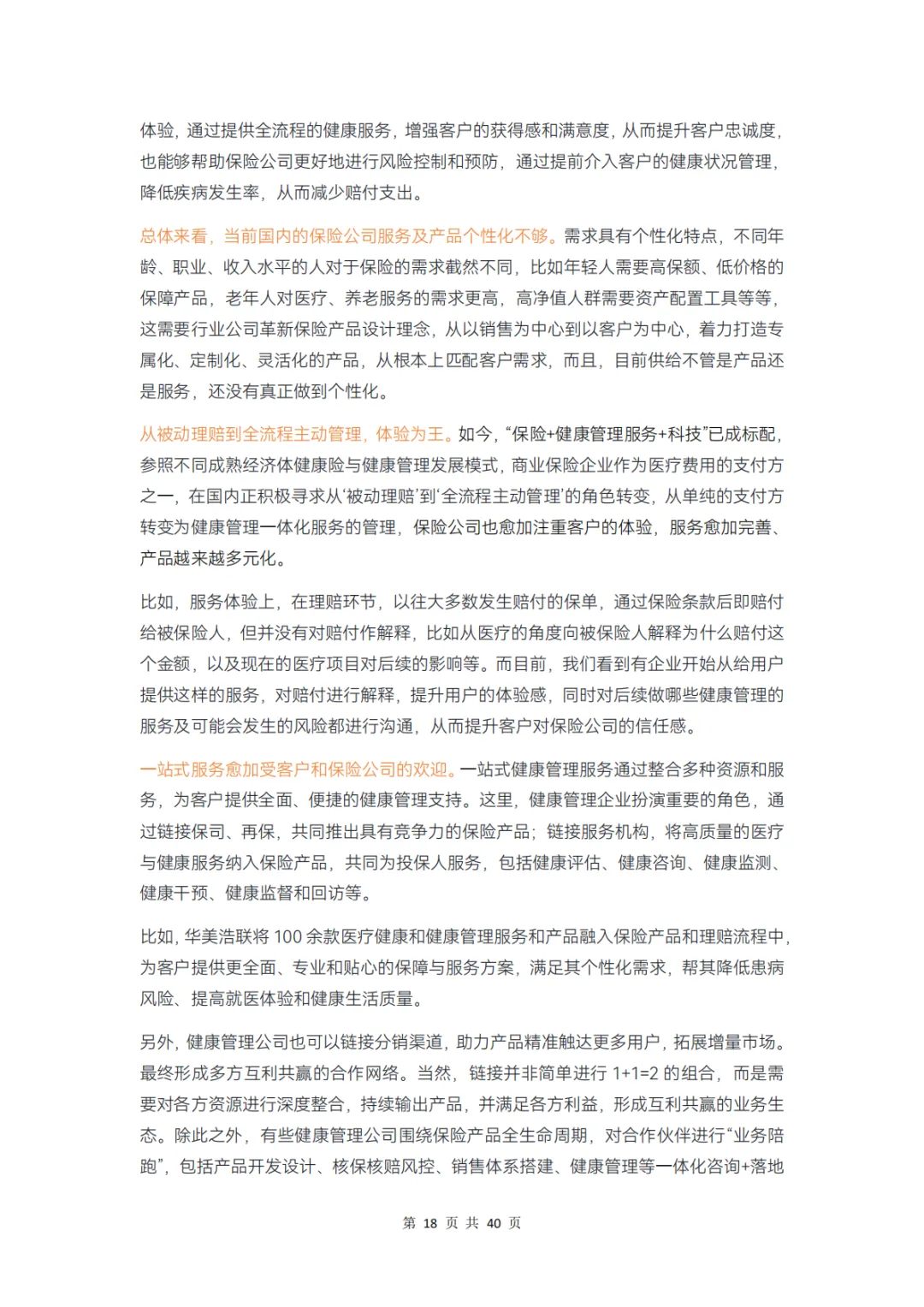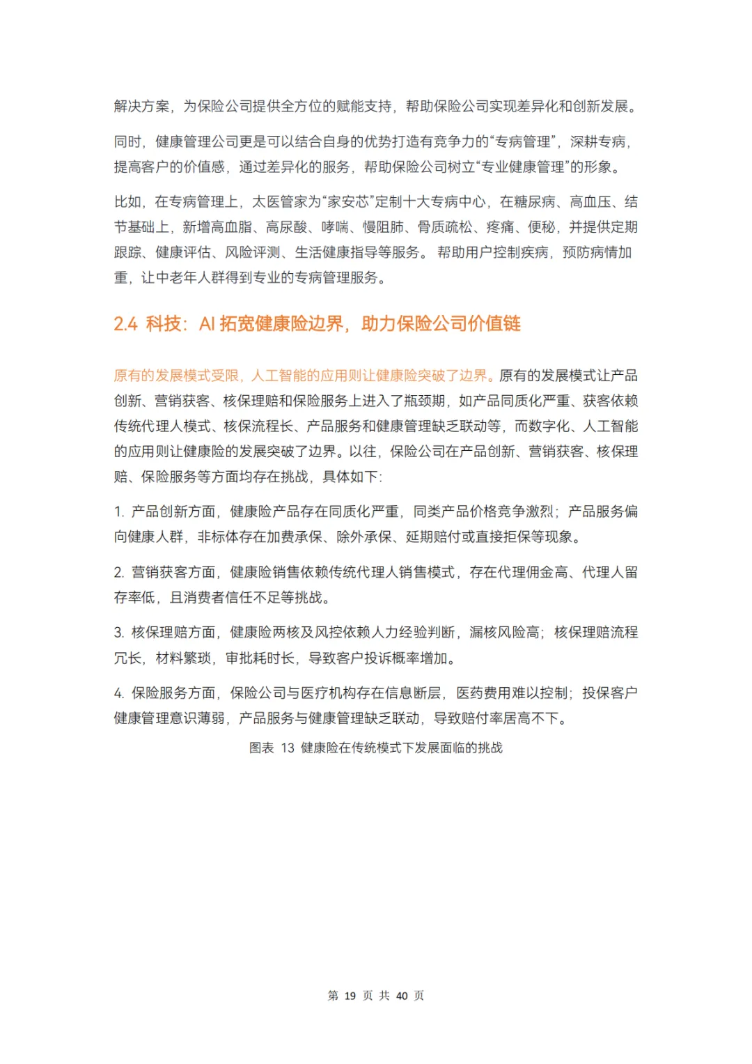 而对保险公司而言,在产品、服务、科技、支付环节上分别存在哪些痛点,健康管理公司又在其中扮演怎样的角色?本报告通过调研 12 家企业、近 20 位专家,对健康险行业的挑战和创新解决方案展开分析,并得出以下结论: