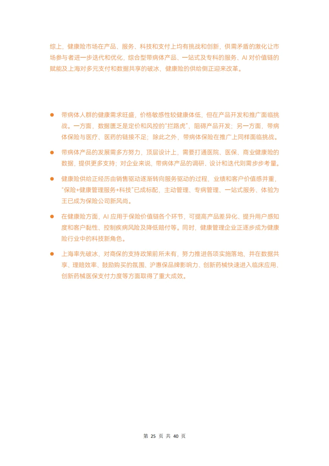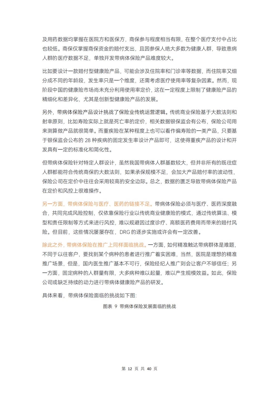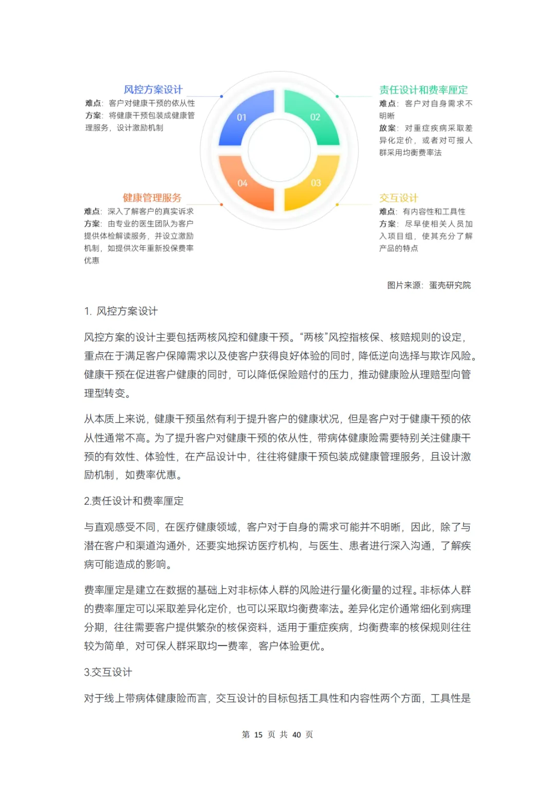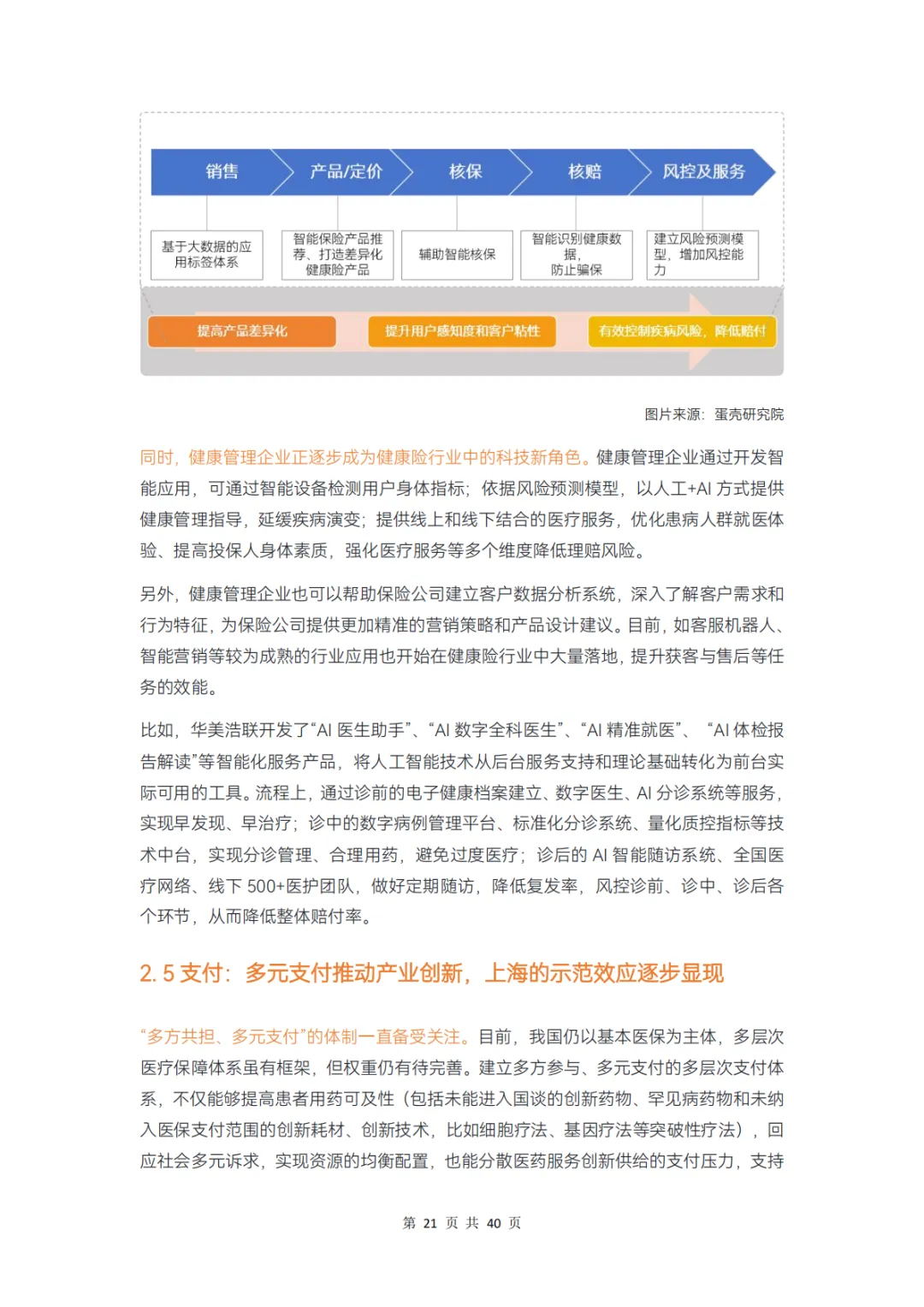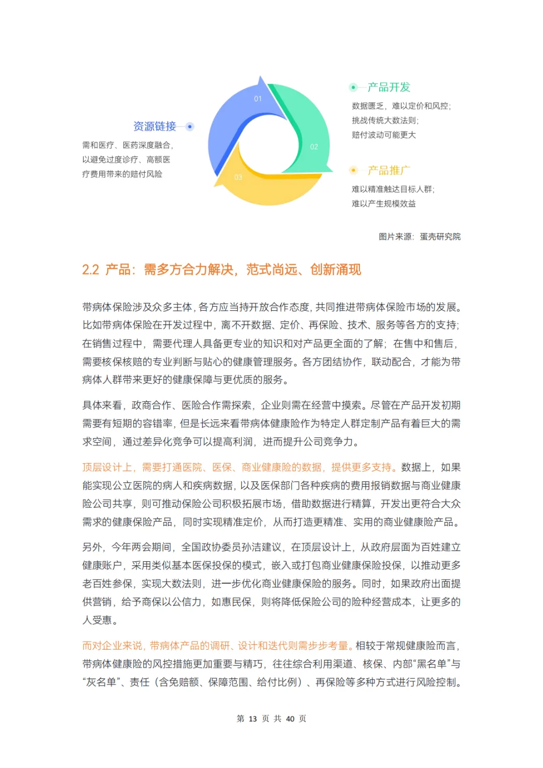 而对保险公司而言,在产品、服务、科技、支付环节上分别存在哪些痛点,健康管理公司又在其中扮演怎样的角色?本报告通过调研 12 家企业、近 20 位专家,对健康险行业的挑战和创新解决方案展开分析,并得出以下结论: