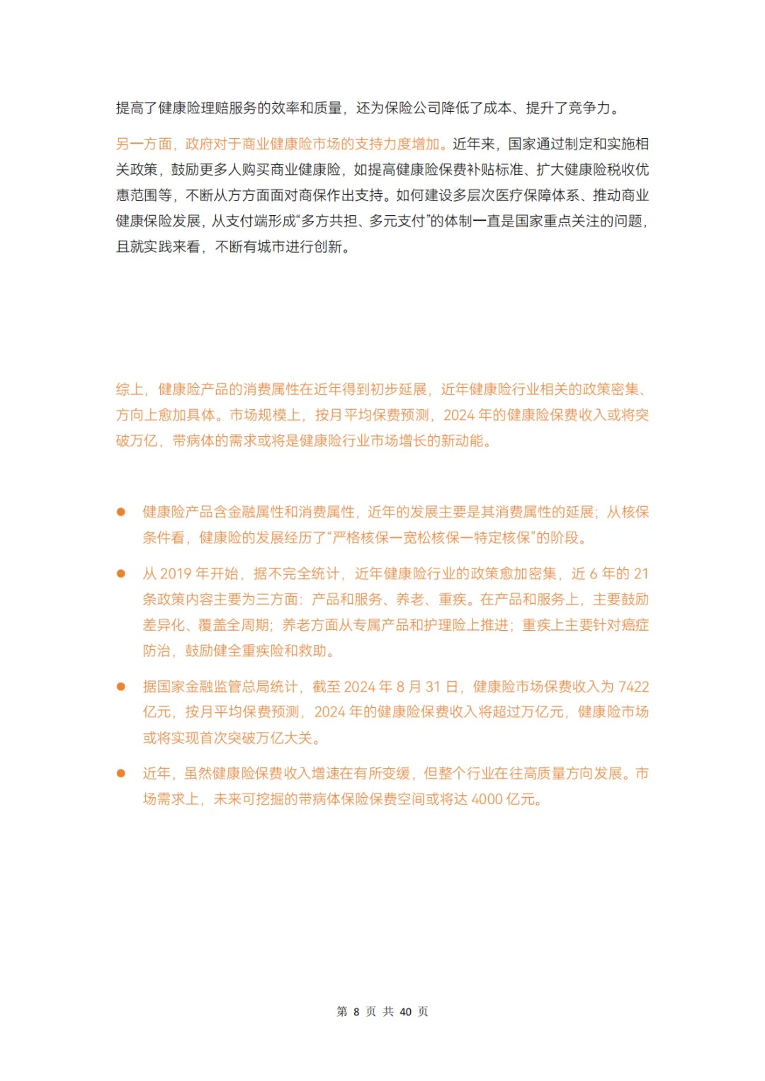 据国家金融监管总局统计,截至 2024 年 8 月 31 日,健康险市场保费收入为 7422亿元,按月平均保费预测,2024 年的健康险保费收入将超过万亿元,健康险市场或将实现首次突破万亿大关。