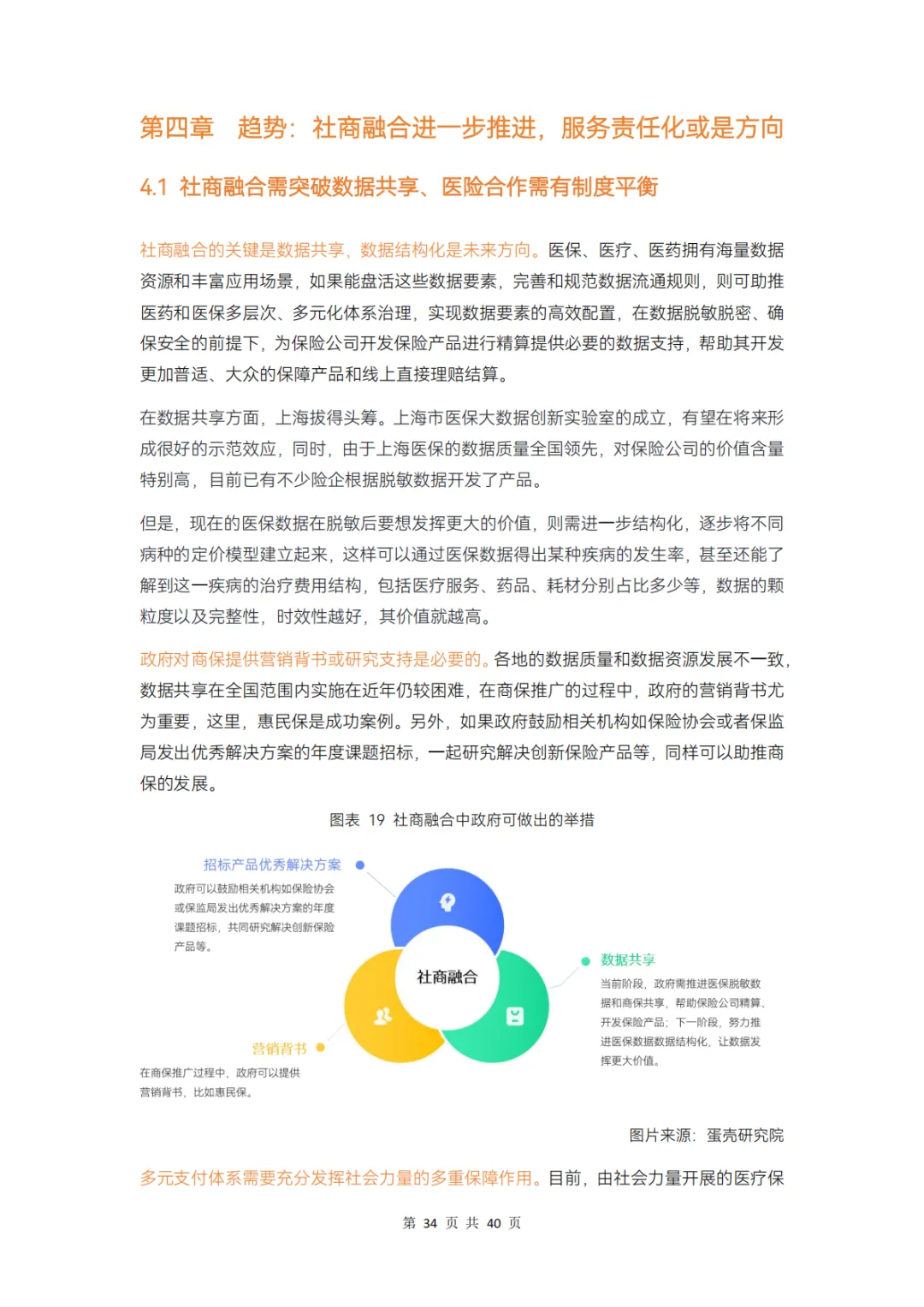 社商融合的关键是数据共享,数据结构化是未来方向。政府方面,除了对医保商保数据共享的支持外,对商保提供营销背书或研究支持也是必要的。
