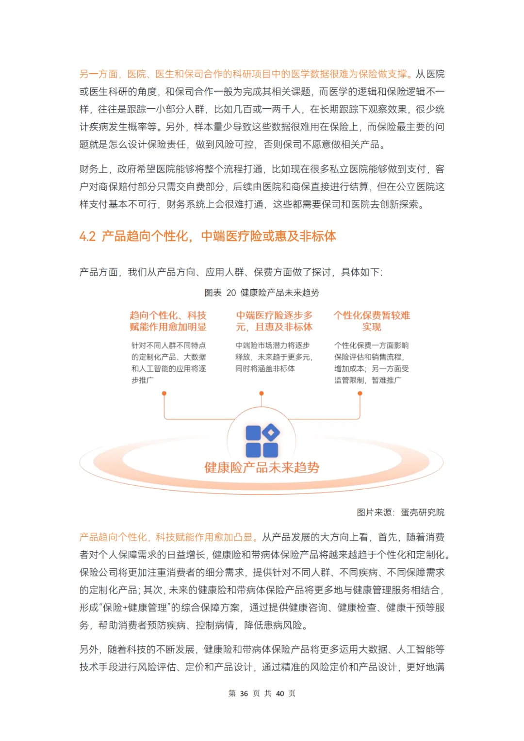 未来,保险产品趋向个性化,科技赋能作用愈加凸显;中端医疗险将逐步多元,并逐步惠及非标体;个性化保费牵涉到保险评估和销售流程,或暂不能实现。