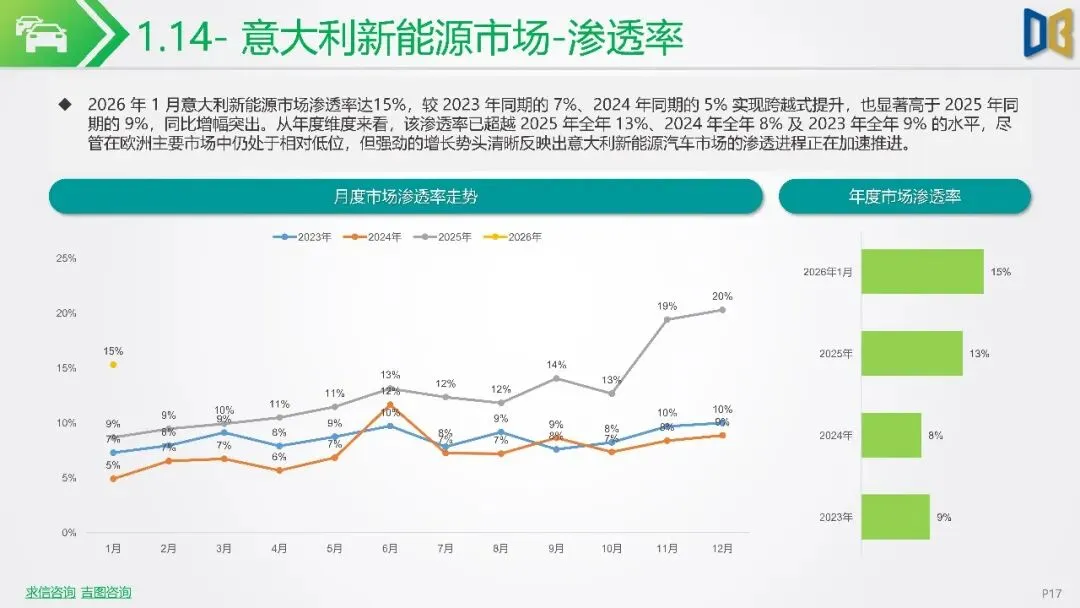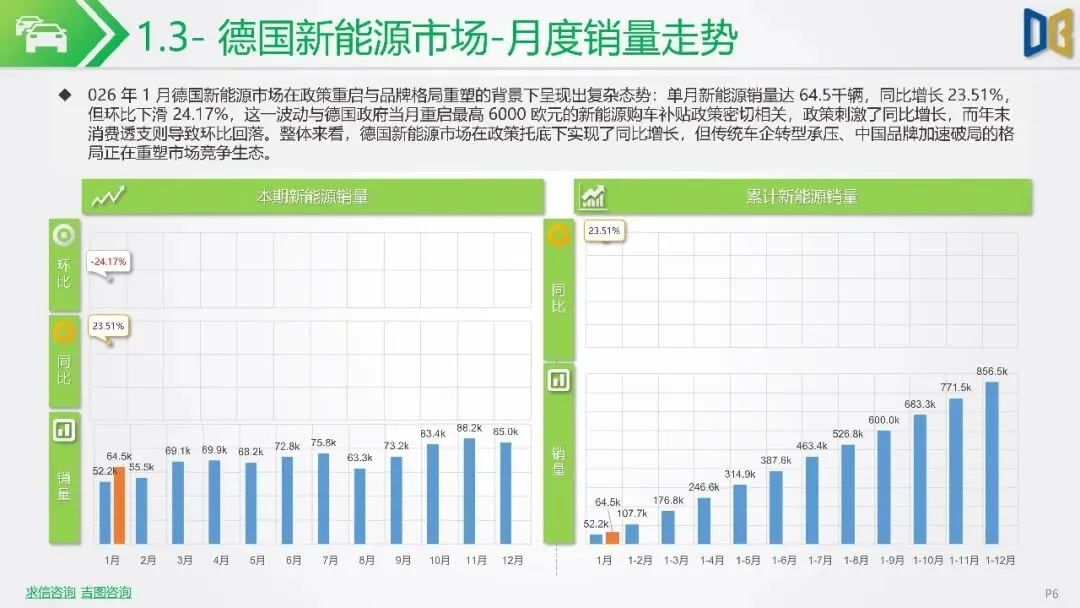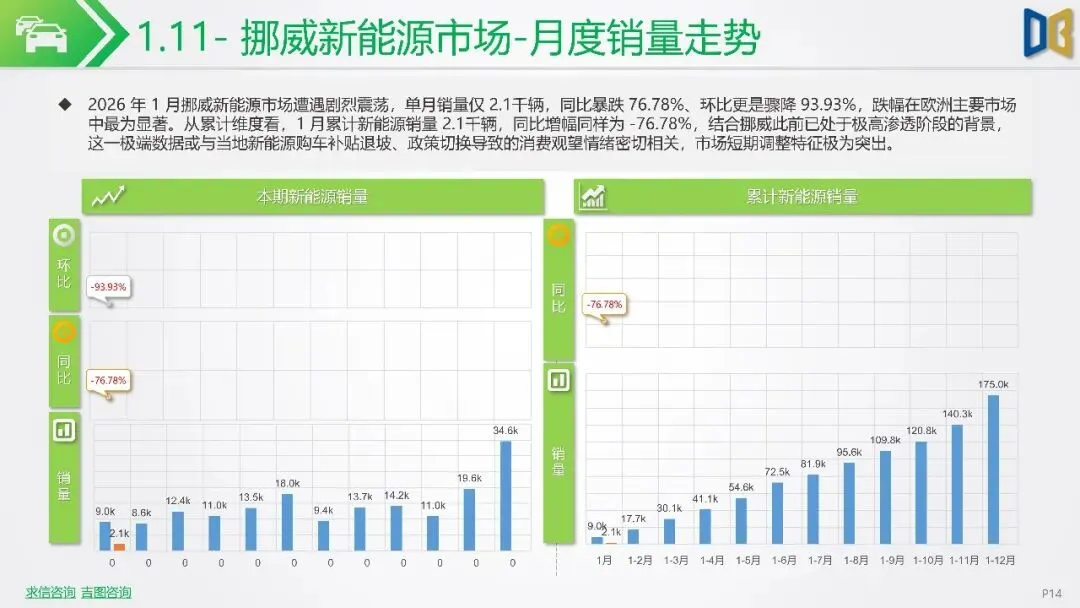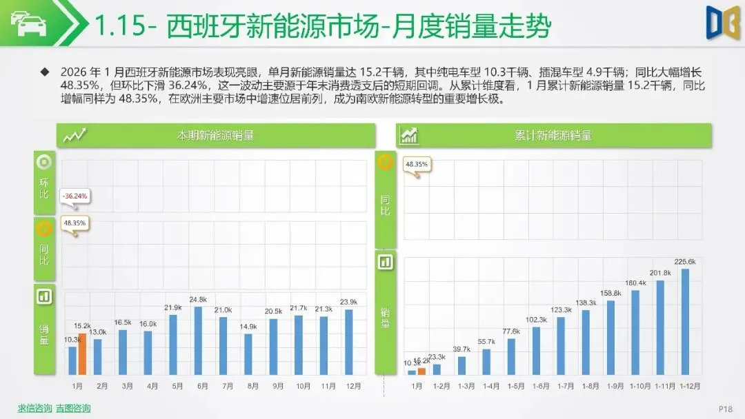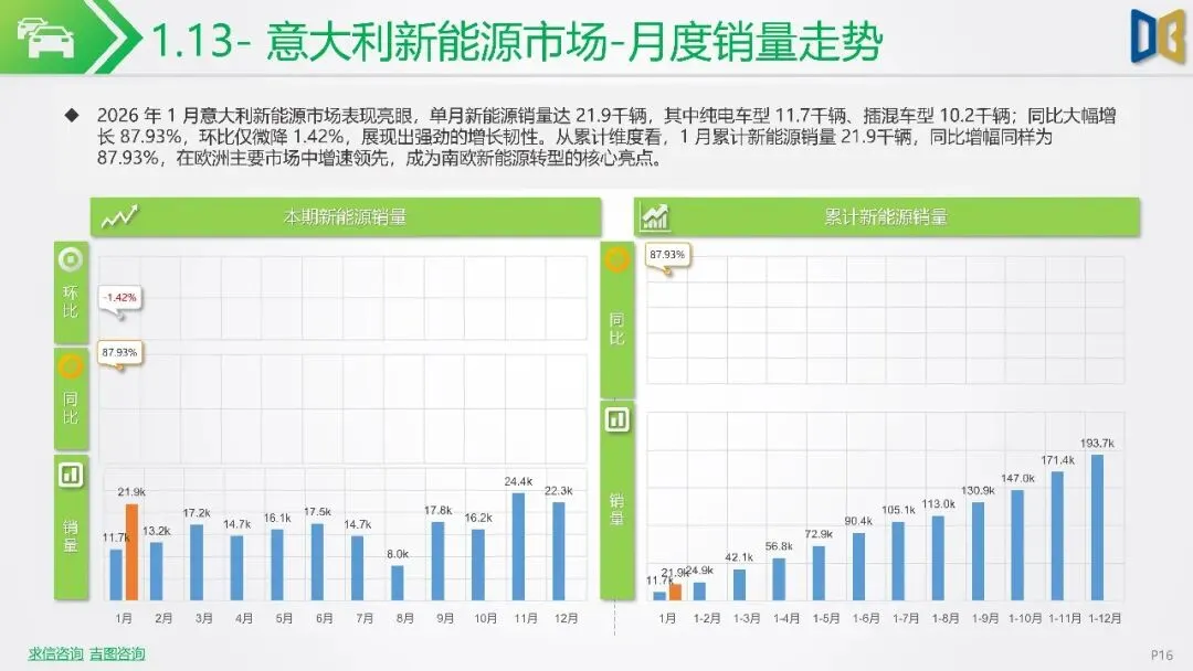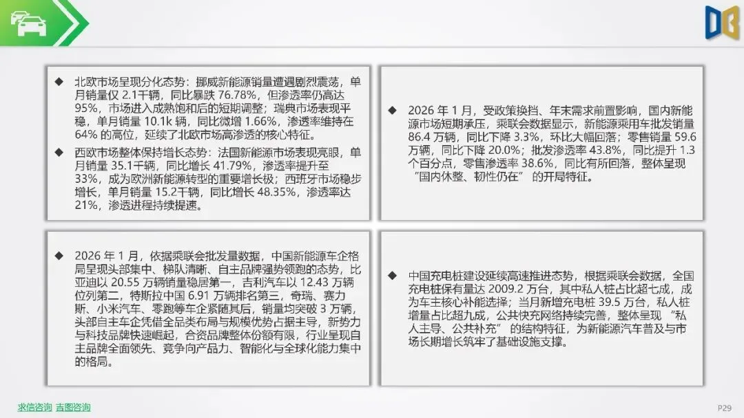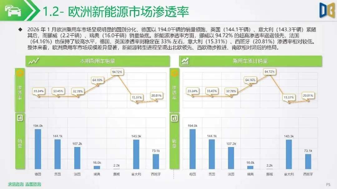 2026年1月全球新能源市场呈现分化格局。欧洲市场短期承压,德国以6.45万辆领跑,意大利、西班牙、法国同比增长显著,挪威因政策调整销量暴跌76.78%但渗透率仍高达95%,北欧整体进入高渗透成熟阶段,南欧则加速追赶。