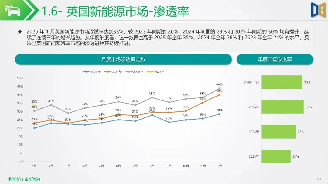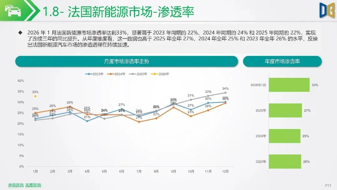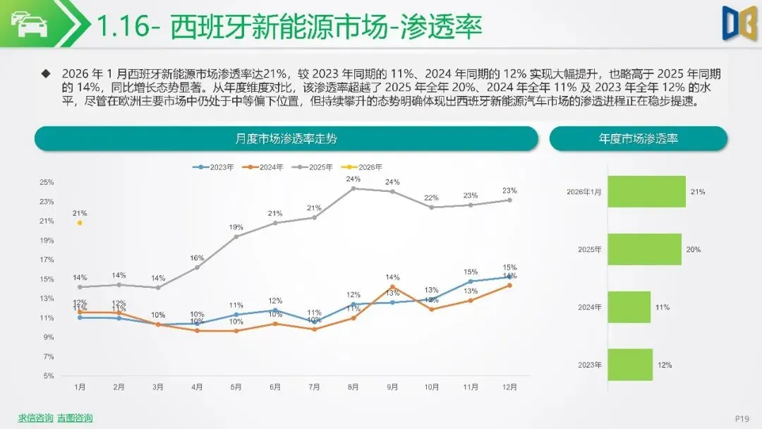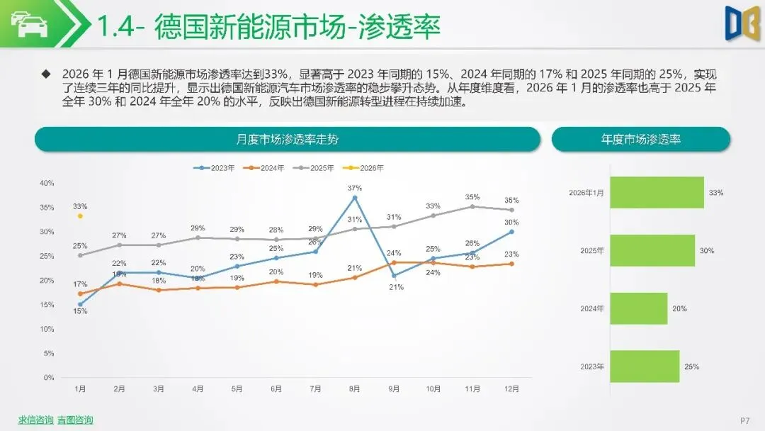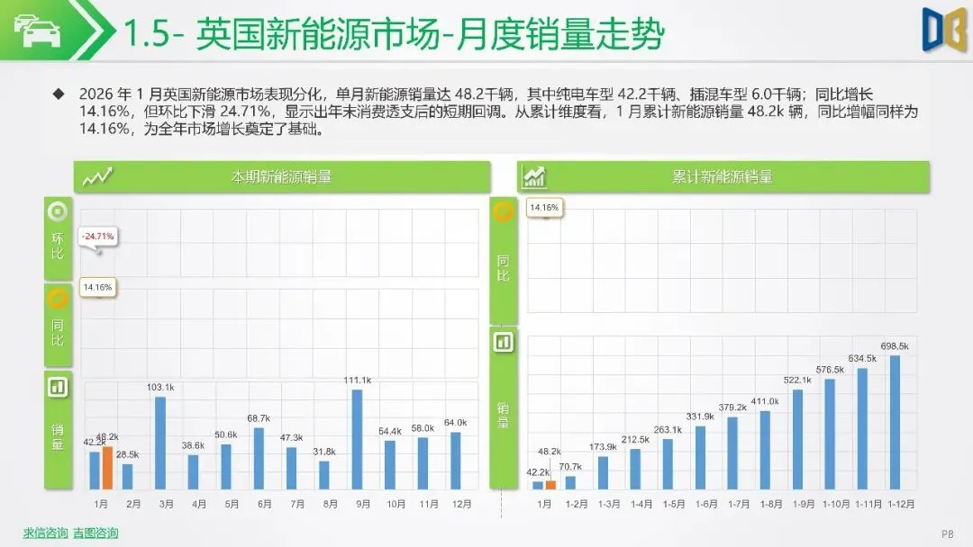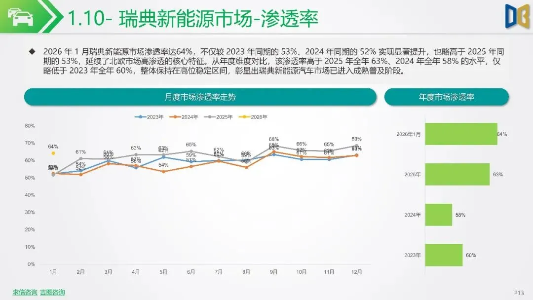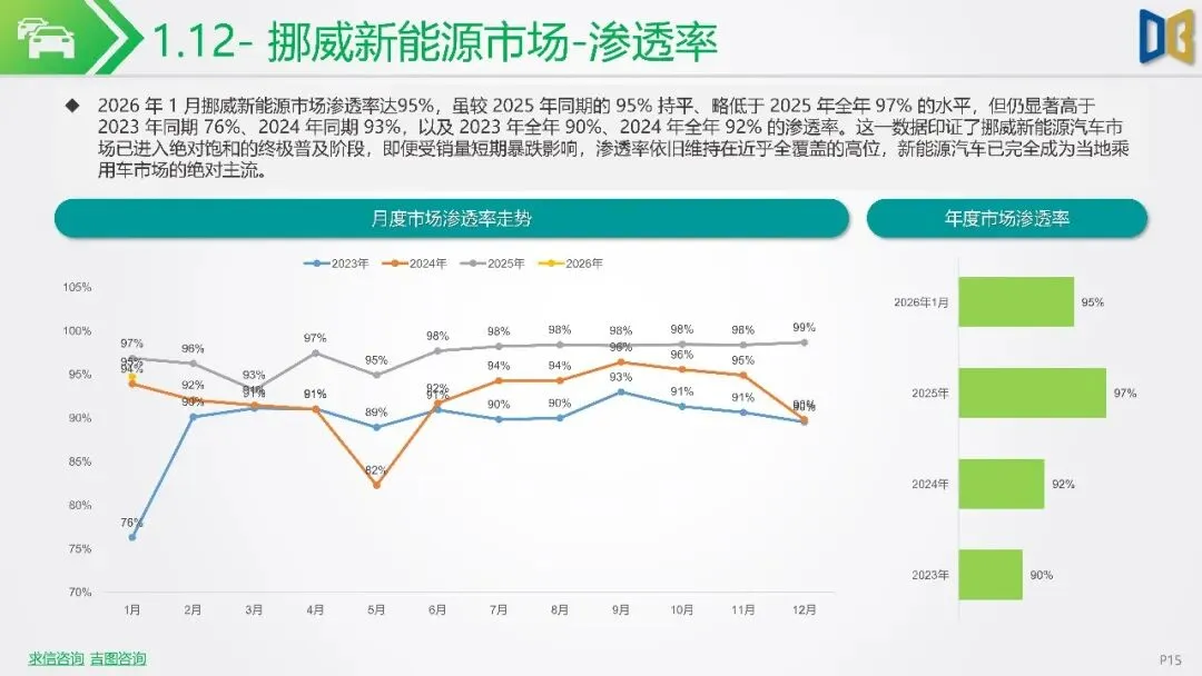 2026年1月全球新能源市场呈现分化格局。欧洲市场短期承压,德国以6.45万辆领跑,意大利、西班牙、法国同比增长显著,挪威因政策调整销量暴跌76.78%但渗透率仍高达95%,北欧整体进入高渗透成熟阶段,南欧则加速追赶。