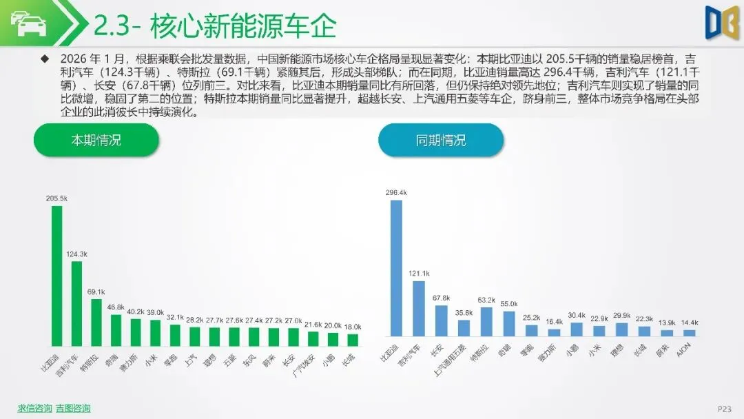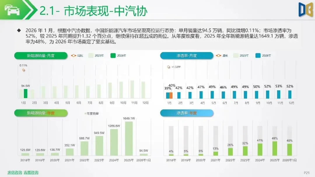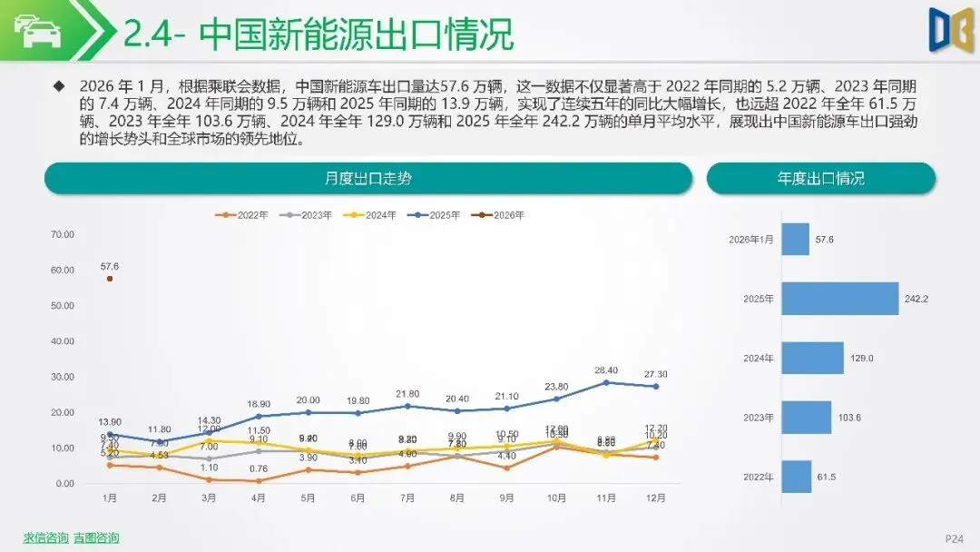 中国市场高位运行,中汽协数据显示新能源销量94.5万辆,渗透率52%维持高位;乘联会批发量86.4万辆同比微降,属年初正常调整。比亚迪以20.55万辆稳居榜首,吉利、特斯拉紧随其后,自主品牌全面领先。出口表现亮眼,1月出口量达57.6万辆,连续五年大幅增长,全球竞争力持续增强。