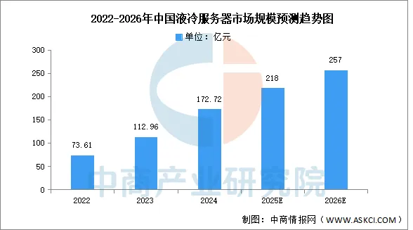 目前,人工智能发展势头强劲,算力需求旺盛,不断推动液冷服务器成为“刚需”硬件。中商产业研究院发布的《2024-2030年中国液冷服务器行业市场发展现状及潜力分析研究报告》显示,中国液冷服务器市场在2024年继续保持快速增长,市场规模约达172.72亿元,同比增长67.0%,2025年市场规模约达218亿元。中商产业研究院分析师预测,2026年中国液冷服务器市场规模有望达257亿元。