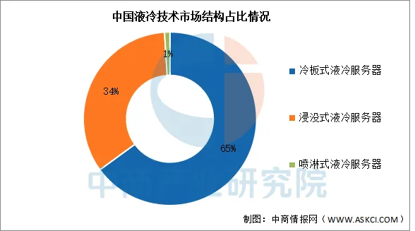 液冷是一种以液体作为冷媒,利用液体流动将数据中心IT设备的内部元器件产生的热量传递到设备外,使IT设备的发热部件得到冷却,以保证IT设备在安全温度范围内运行的冷却方式。目前,液冷技术类型根据冷却液和发热设备接触换热方式的不同,可划分为冷板式液冷、浸没式液冷和喷淋式液冷。其中,冷板式液冷技术开发较早,是目前成熟度最高、行业布局最多、应用最广泛的液冷散热方案之一,市场占比约为65%。此外,浸没式液冷市场占比约为34%,喷淋式液冷市场占比约为1%,仍有较大发展空间。
