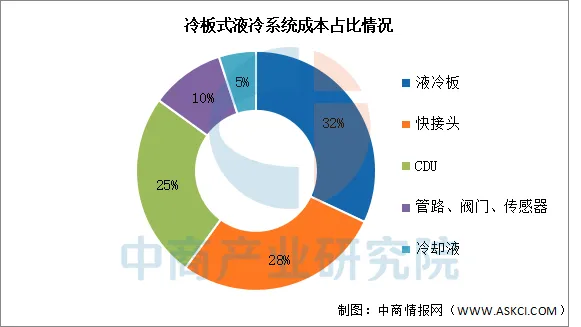 冷板式液冷系统占据市场90%以上份额,在组成成本中,液冷板占比32%居首,快接头以28%紧随其后,CDU占25%位列第三,三者合计达85%;管路阀门等配件占10%,而冷却液因用量较少仅占5%。