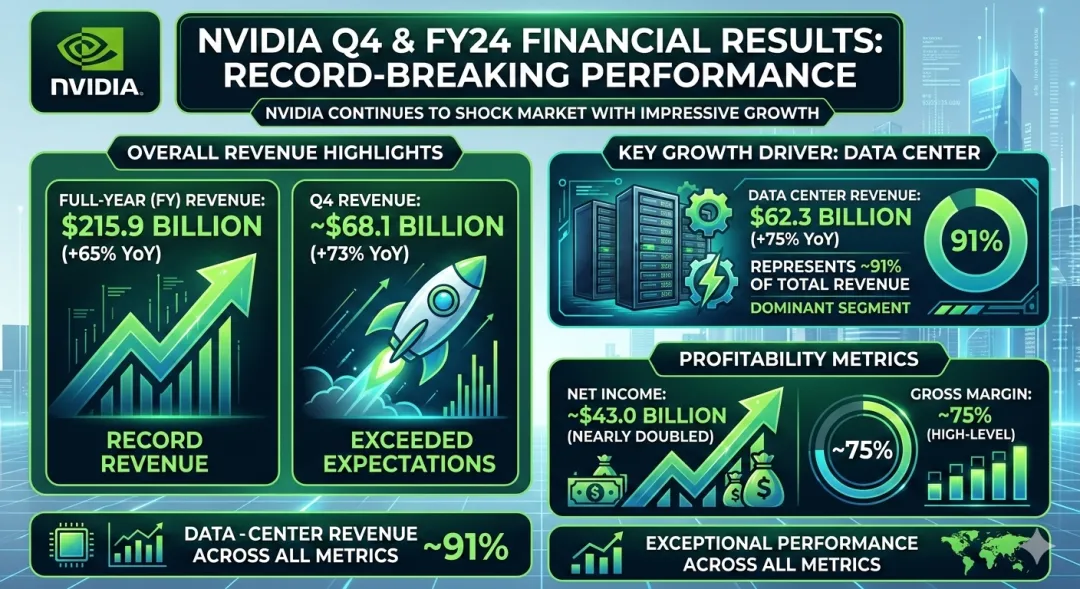 刚刚过去的财报季,英伟达用一份看似无可挑剔的成绩单再次震撼市场。根据最新财报,公司第四财季实现营收约681亿美元,同比增长73%,远超市场预期;全年营收为2159亿美元,同比增长65%,同样创纪录。数据中心业务营收为623亿美元,同比增长75%,占总营收约91%,继续主导增长;净利润近430亿美元,同比接近翻倍,同时毛利率维持在约75%的高位水平,这几乎可以用“完美”来形容业绩表现。公司管理层更是给出了强劲的下一季度营收预期,预计达到约780亿美元的规模,暂时抹去了营收下滑的担忧。这样的成绩在半导体行业中堪称巅峰,而且与人工智能基础设施需求增长密切相关,尤其是数据中心核心GPU的爆发式增长,进一步巩固了英伟达在AI芯片领域的领先地位。从数字看,英伟达不只是“增长”,而是几乎把整个行业的机会收入囊中。二、数据好到爆,股价却下跌