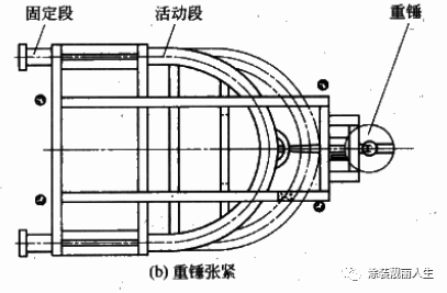 用于封闭轨悬挂输送机的张紧装置有两种标准形式,即弹簧张紧装置和重锤张紧装置,如图。弹簧张紧装置依靠压缩弹簧的恢复力,自动吸收链条因磨损、受热引起的伸长量,一般仅用于温度变化小、输送负载比较小、输送链条长度比较短的线路,并需要定期调整弹管的恢复力。