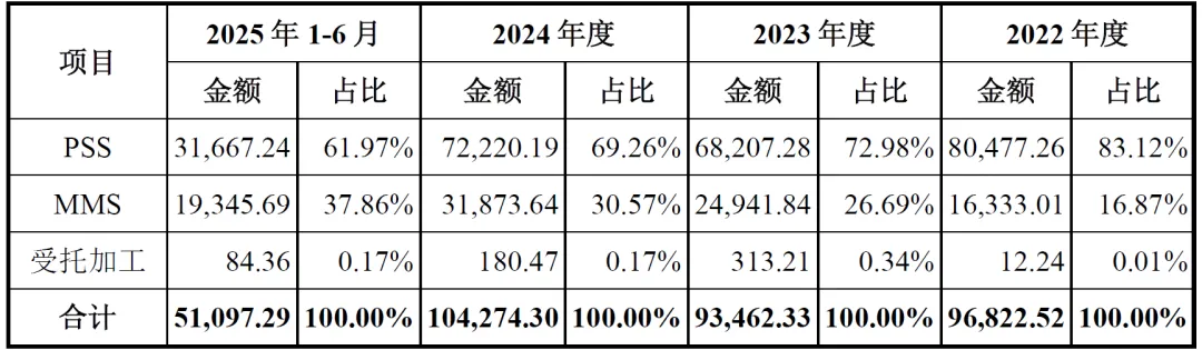 公司核心业务为图形化衬底的研发、生产与销售,同时开展退役半导体设备改造及贸易业务。报告期内,主营业务收入分别为96,822.52万元、93,462.33万元、104,274.30万元和51,097.29万元,呈增长趋势。其中,PSS产品为主要收入来源,2025年1-6月占比61.97%;MMS产品收入占比快速提升,从2022年的16.87%增至2025年1-6月的37.86%。