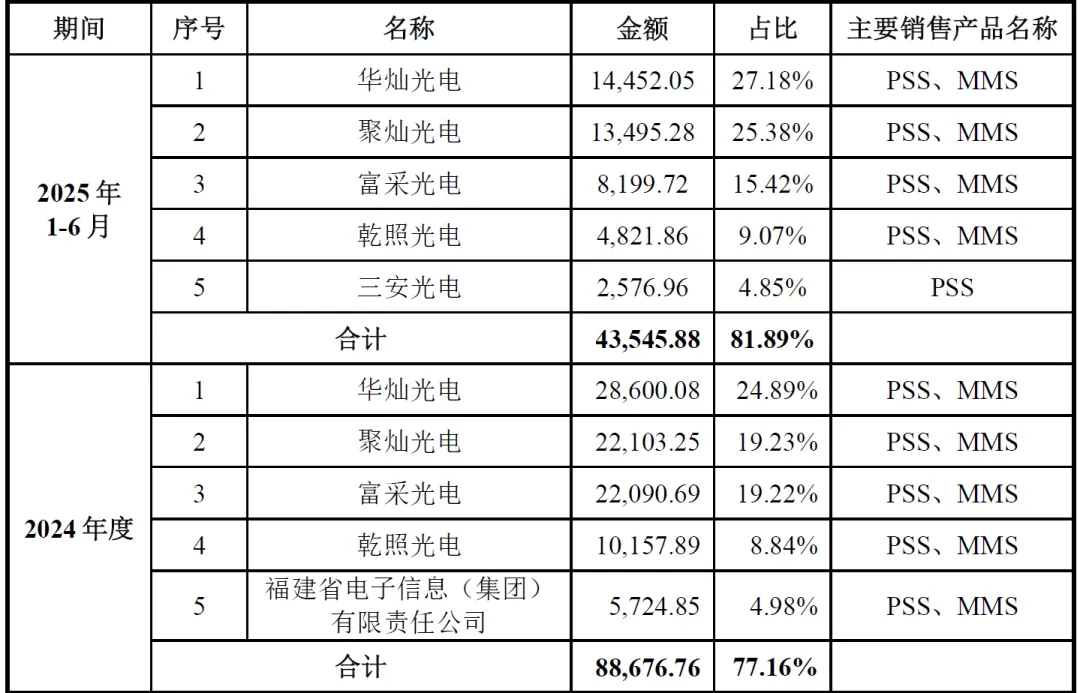 报告期内,公司前五大客户主要包括华灿光电、聚灿光电、富采光电、乾照光电、三安光电等海内外头部LED芯片企业,不存在向单个客户销售比例超过当期主营业务收入总额50%的情况。公司向前五大客户的销售收入占营业收入比例分别为74.61%、69.35%、77.16%和81.89%,客户集中度较高,主要系全球LED芯片行业本身集中度较高以及公司聚焦头部优质客户所致。
