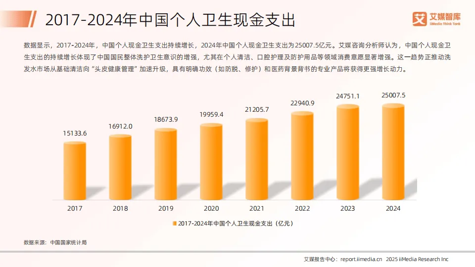 2025年中国洗发水行业迎来高质量发展阶段,行业整体向“头皮健康管理”“精细化护发”升级,消费端则呈现理性化、个性化、功效化的显著特征。艾媒咨询的调研数据显示,2017-2024年中国个人卫生现金支出持续增长至25007.5亿元,2025年护发产品市场规模达691.07亿元,美容美发行业市场规模增至4459亿元,居民健康意识提升与消费升级成为行业增长核心动力,具备明确功效和专业背景的洗护产品增长潜力突出。