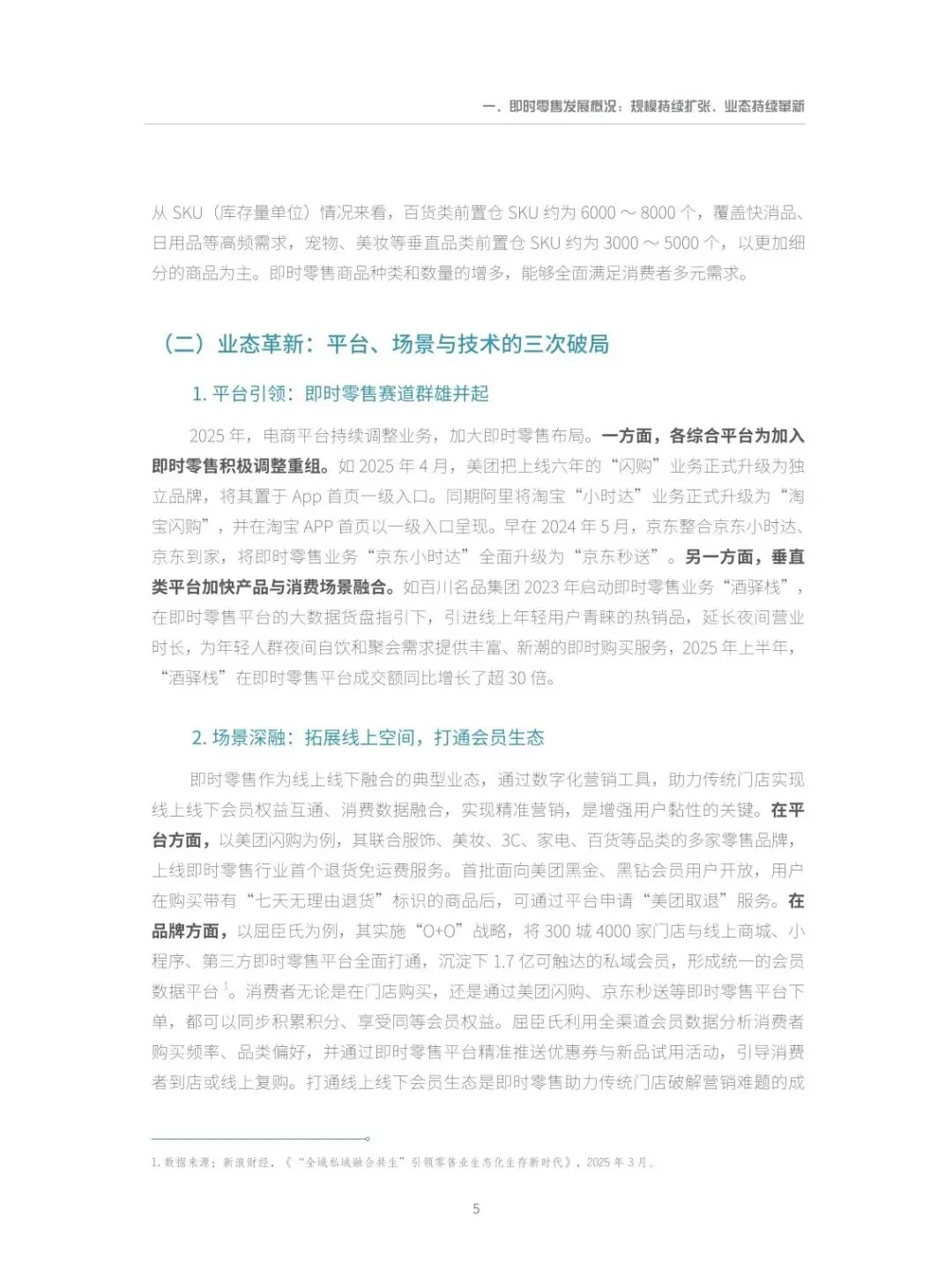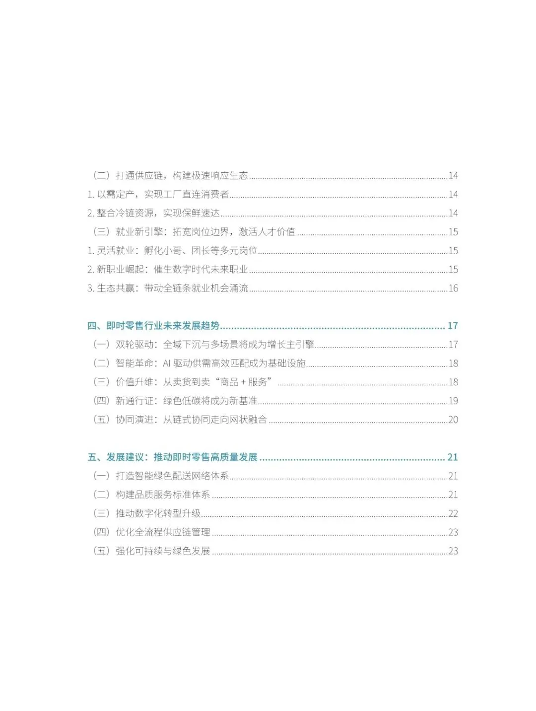 :对大型连锁商超,即时零售不仅是渠道拓展,更推动组织变革与数字化再造;传统小店通过本地化创新,转型为邻里型即时零售供给站。同时,行业以需定产重构供应链价值链,整合冷链资源实现保鲜速达,还拓宽就业边界,孵化骑手、团长等多元岗位,催生数字时代新职业,带动全链条就业机会。 - 未来呈现五大发展格局,多维度创新突破