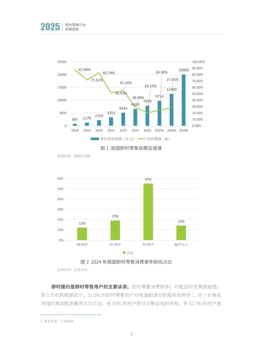 :2024 年我国即时零售规模达 7810 亿元,同比增长 20.15%,远超同期网络零售和社会消费品零售总额增速,2025 年预计达 9714 亿元,2026 年将迈入万亿级市场。用户规模不断扩大,31-45 岁消费群体占比达 55%,90 后成为核心客群,消费场景从应急需求延伸至日常采买、出差、校园等多元场景,推动行业持续增长。 - 行业竞争逻辑升级,聚焦多维体验竞争