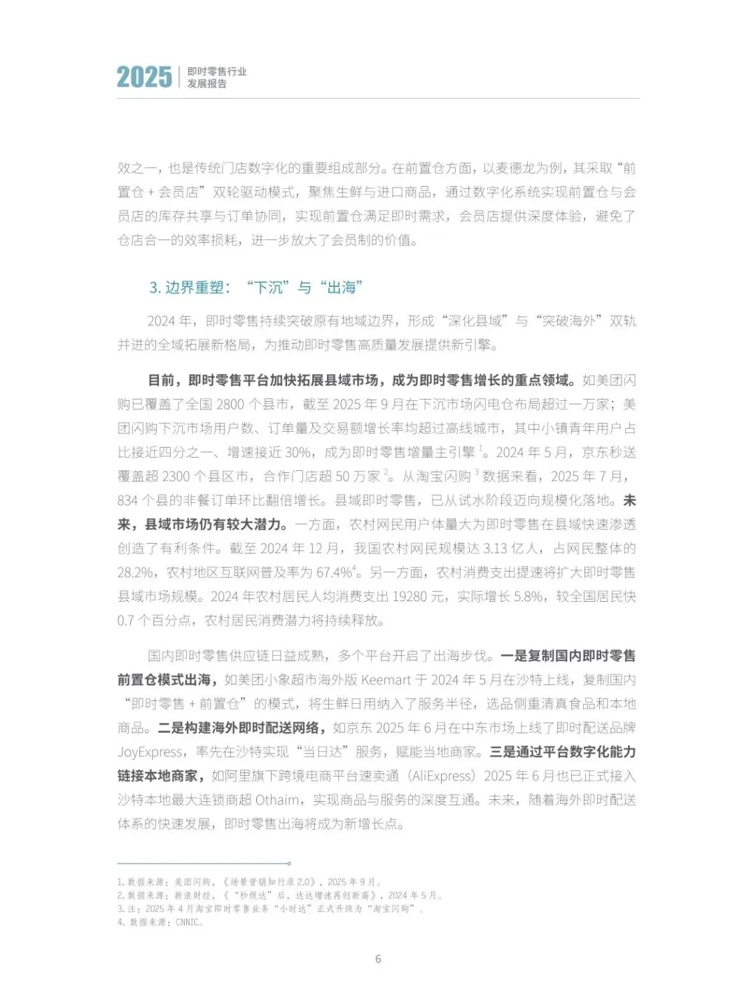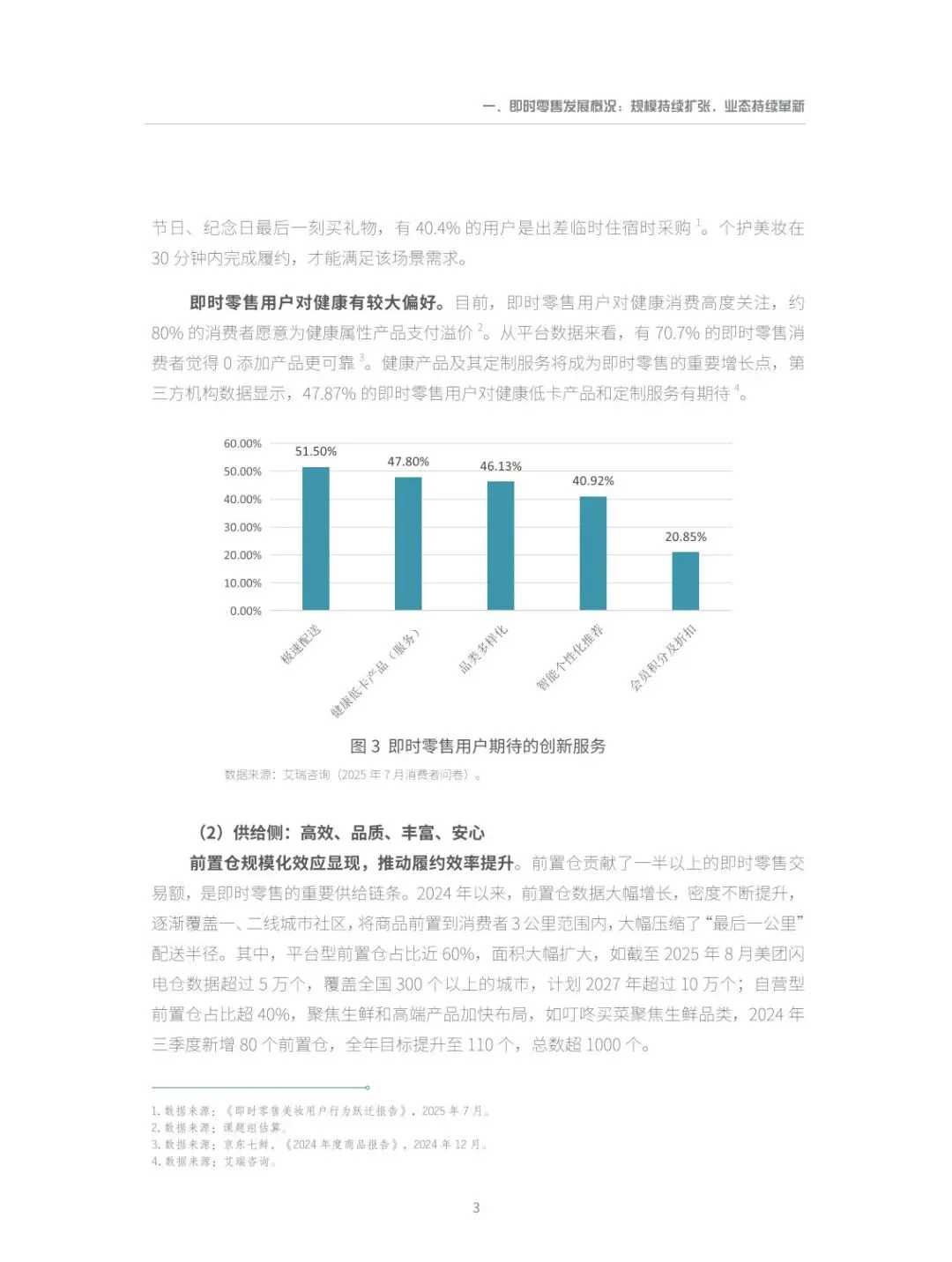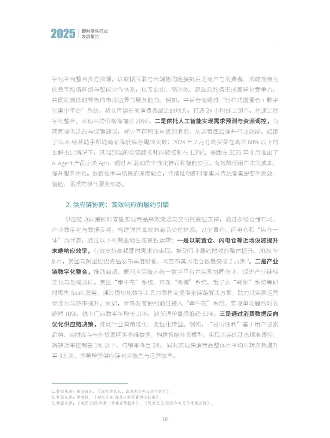 :一是全域下沉与多场景覆盖成为增长主引擎,县域市场与夜间、办公等长尾场景潜力释放;二是 AI 驱动供需高效匹配,贯穿选品、配送等全环节;三是价值升维至 “商品 + 服务”,准时保、品质保成为标配;四是绿色低碳成为新基准,可循环包装、新能源运力广泛应用;五是从链式协同走向网状融合,构建柔性供应链与会员生态协同体系。