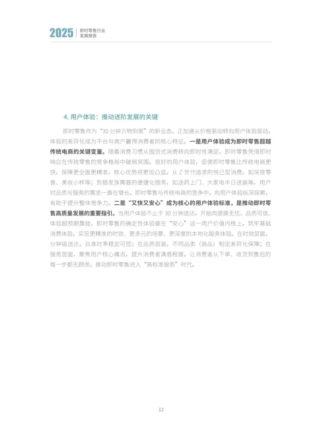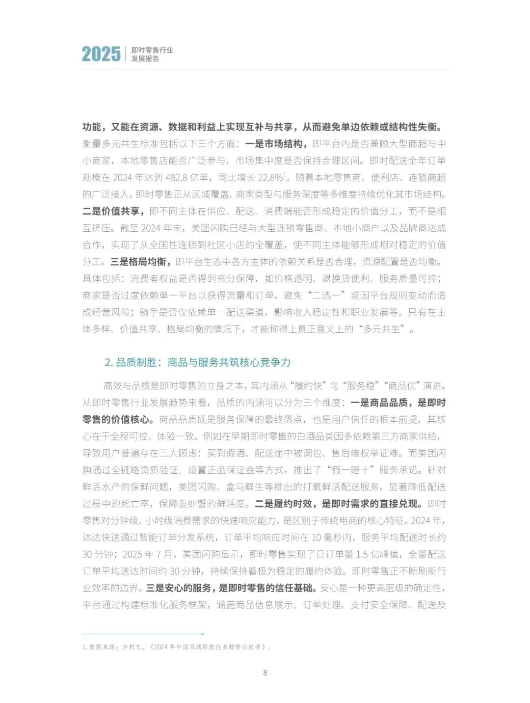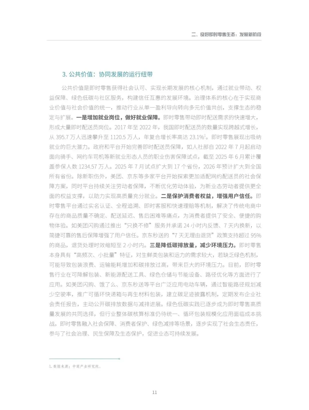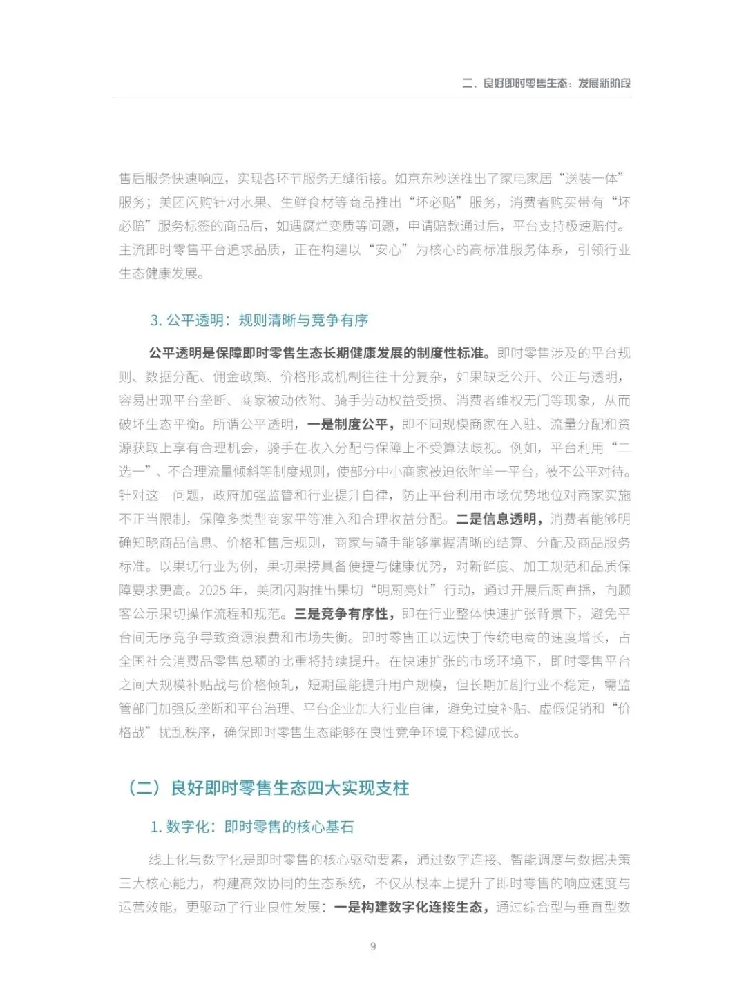:行业已从单纯追求 “履约快” 的单一维度,升级为 “服务稳”“商品优”“体验安心” 的多维竞争。“安心” 成为核心竞争力,主流平台通过全流程服务保障计划、正品保障、极速赔付等举措,构建高标准服务体系,同时加大对商家的资源投入,推动形成商家经营更稳、信任度更高的健康生态。 - 构建良好生态体系,明确衡量标准与实现支柱