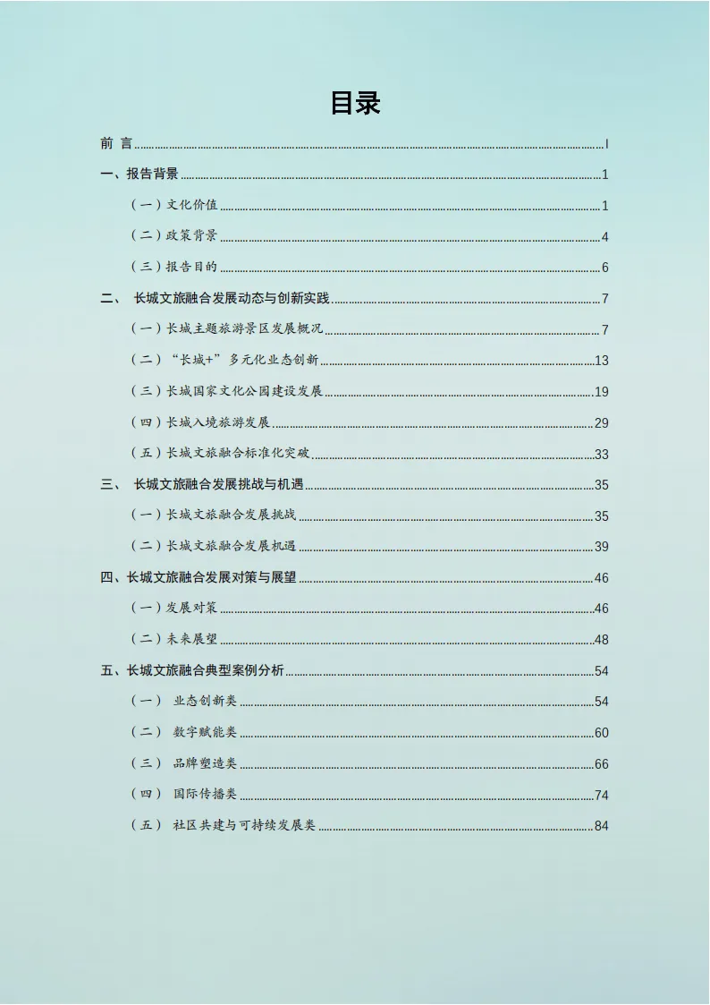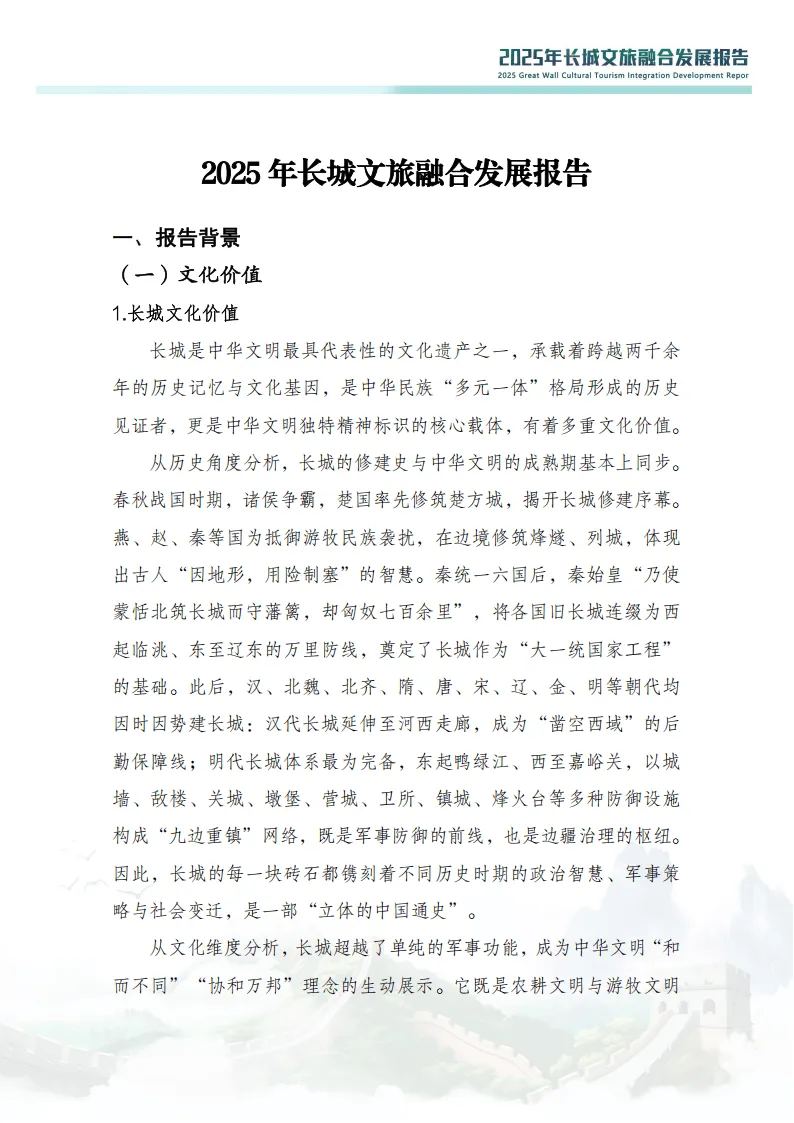 《2025年长城文旅融合发展报告》系统梳理了长城文旅融合的发展现状、挑战机遇与实践路径,以“保护优先、合理利用”为核心原则,展现了这一世界级文化遗产在文旅深度融合背景下的发展全貌。