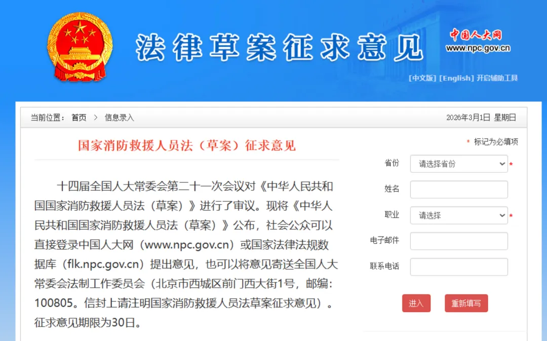 2026年2月25日,《国家消防救援人员法(草案)》提请十四届全国人大常委会第二十一次会议首次审议。草案共7章47条,是我国首部专门规范消防救援人员管理与保障的法律,回应2018年队伍改革转制,为“火焰蓝”定身份、明权责、强保障,标志消防救援事业法治化迈上新台阶。