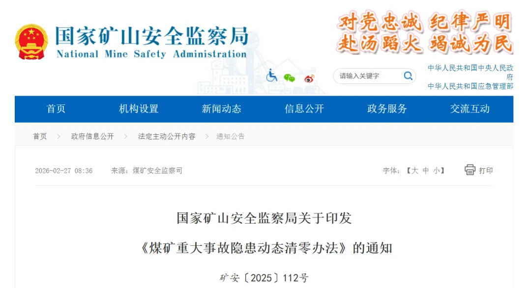 2月27日,国家矿山安全监察局印发《煤矿重大事故隐患动态清零办法》,适用于煤矿开展重大事故隐患自查自改和煤矿安全监管监察部门开展涉及重大事故隐患的行政检查执法、举报核查、挂牌督办、整改复查等工作。