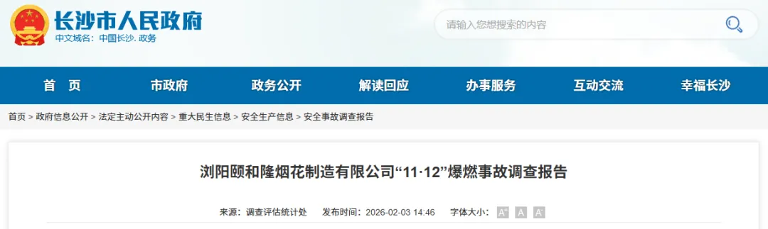 2月3日,长沙市人民政府网站公布《浏阳颐和隆烟花制造有限公司“11·12”爆燃事故调查报告》。经调查认定,该事故是因风险辨识和隐患排查不到位、违规将维修施工项目发包给不具备资质的个人以及违反动火作业规定要求等因素导致的生产安全责任事故。