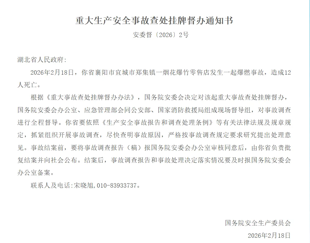 国务院安委会对湖北宜城烟花爆竹爆燃事故查处挂牌督办