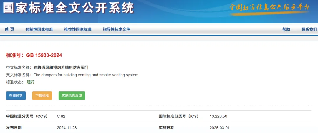 2024年11月28日,GB15930-2024《建筑通风和排烟系统用防火阀门》正式发布,已于2026年3月1日实施,全面替代GB15930-2007版标准。