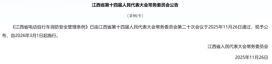 2025年11月,江西省人民代表大会常务委员会发布公告,《江西省电动自行车消防安全管理条例》已由江西省第十四届人民代表大会常务委员会第二十次会议于2025年11月26日通过,现予公布,自2026年3月1日起施行。>>详细