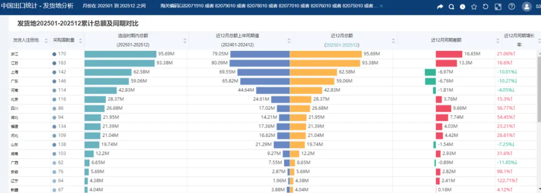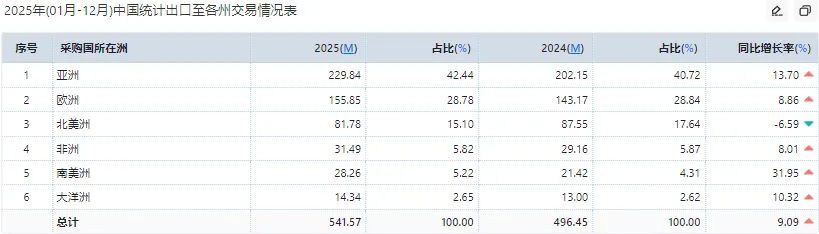 2025年中国超硬合金刀具出口总额 541.57亿美元,同比增长9.09%,区域市场呈现“亚洲稳盘、南美爆发、欧洲承压”的格局,亚洲以42.44%的占比稳居第一,成为出口核心基本盘,受益于供应链就近配套优势;欧洲受本土高端刀具品牌挤压与制造业成本压力,增速相对平缓;南美等新兴市场需求快速释放,以31.95%的增速成为外贸增长新亮点。