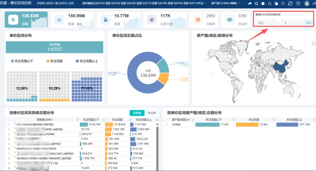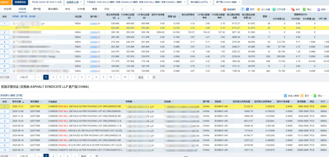 以印度市场为例,企业可借助海关数据工具,精准定位超硬合金刀具客户的采购频率与价格区间,追踪印度等市场的真实需求及买卖双方采购关系,通过可视化分析维度识别高频高额、低频高额、高频低额、低频低额四类客户,分别用于稳营收、冲业绩、扩覆盖、提效率;同时针对价格关注区间以上、以内、以下的采购商差异化运营,主打高端定制、性价比方案与规模化供应。
