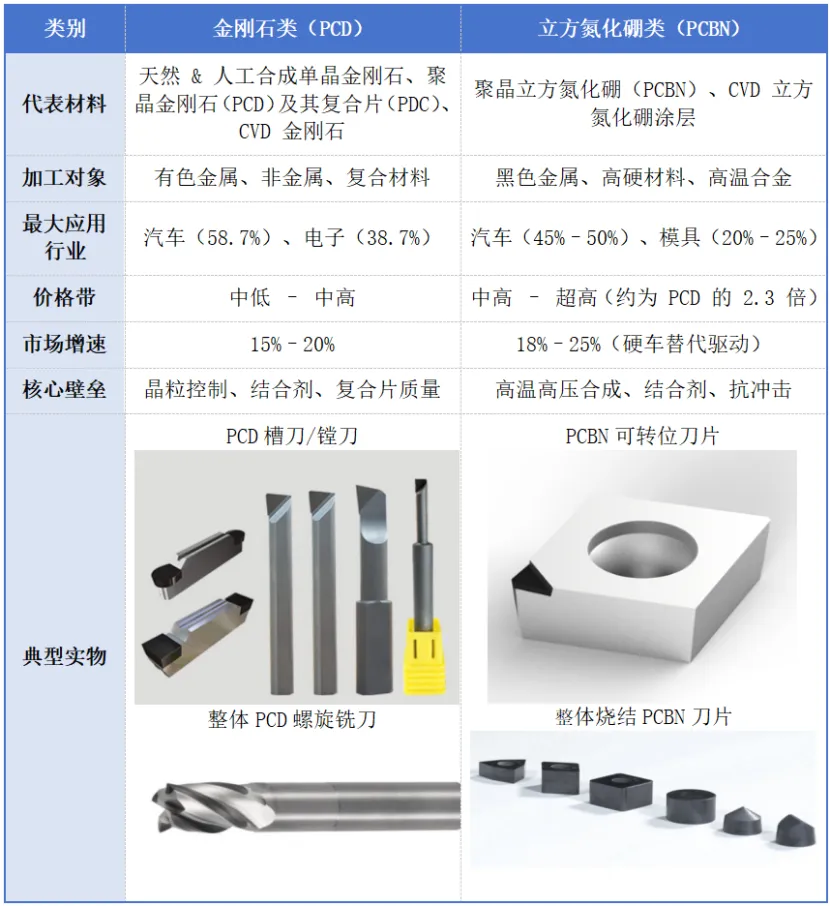 超硬合金刀具是现代工业追求极致效率与高品质加工的产物,尤其在航空航天和新能源汽车零部件的精密加工领域,这种需求更为迫切。超硬合金刀具材料主要为金刚石与立方氮化硼两类,其化学成分及其形成硬度的规律与其他刀具材料(硬质合金、高速钢等)不同,它们的硬度大大高于其他物质,同时具备高耐磨耐热性、良好的导热性、工艺性以及较低的摩擦系数等特点。