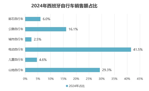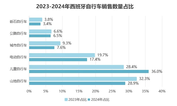2024年的销售数据显示,西班牙自行车市场呈现出明显的“量价分离”特征。从销量结构看,儿童自行车凭借较低的单价在2024年销量激增,超越山地自行车成为市场份额最大的品类,占比高达36%。