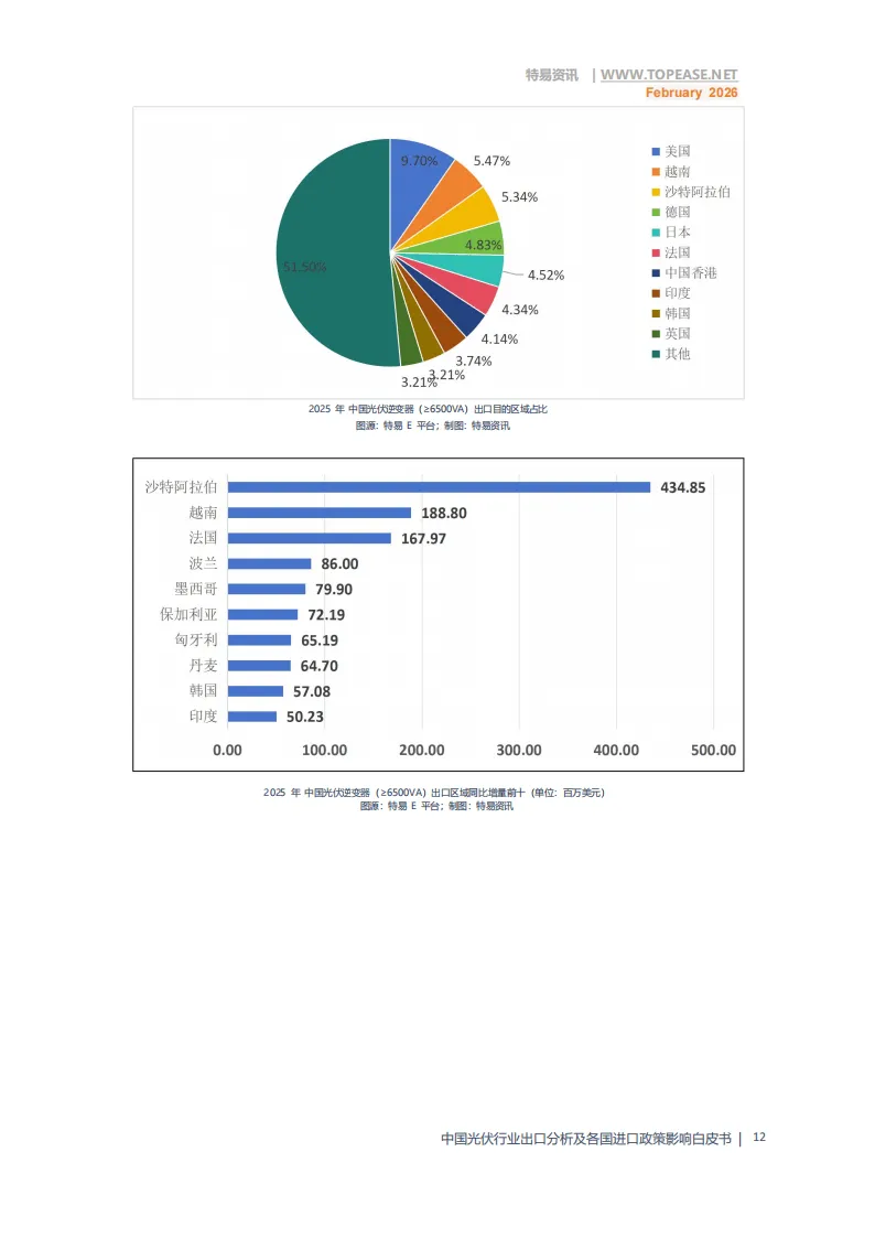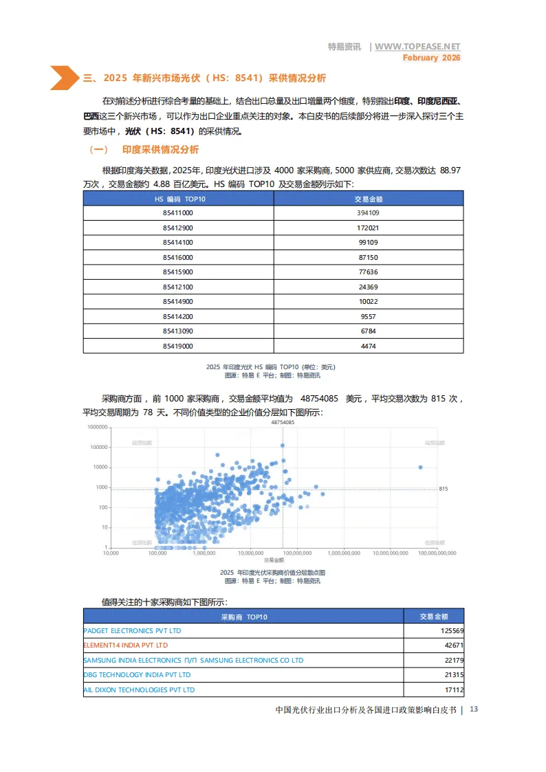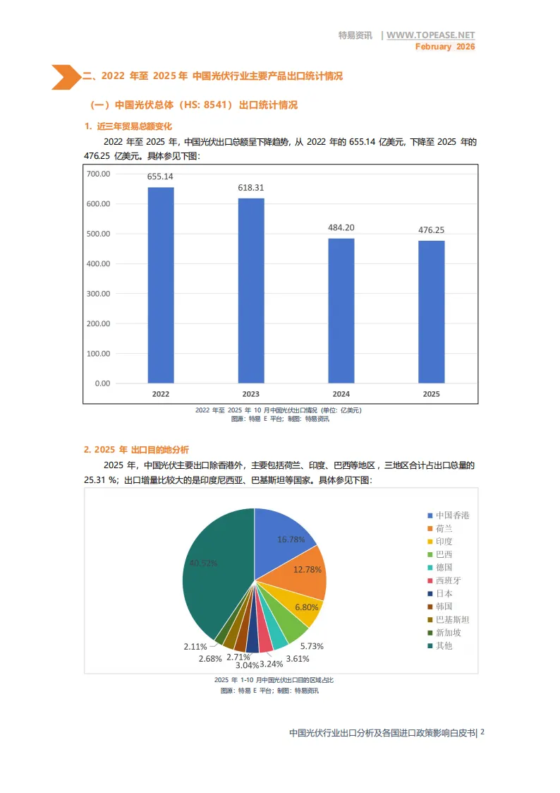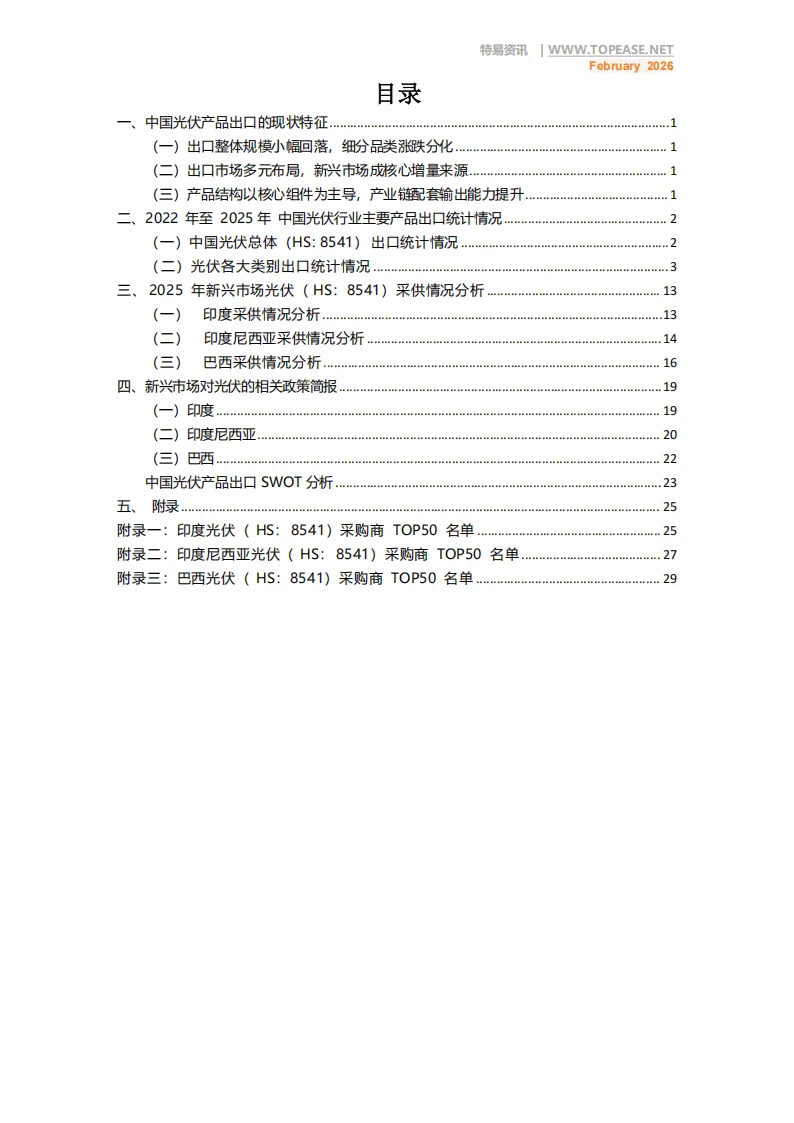 这份2026年2月发布的中国光伏行业出口分析白皮书,展现了2022-2025年中国光伏产品出口的整体特征、细分品类与市场表现,并分析了印度、印尼、巴西三大新兴市场的采供及政策情况,同时完成了行业出口SWOT分析。