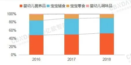 辅食营养品中,婴幼儿营养品销售占比逐年提升,从2016年不足50%提升至2018年50%以上,宝宝零食销售占比呈现逐年下降趋势。