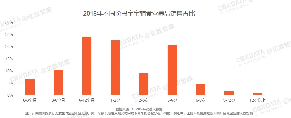 从宝宝年龄分布上看,6-12个月、1-2岁和3-6岁阶段辅食营养品消费金额最高。