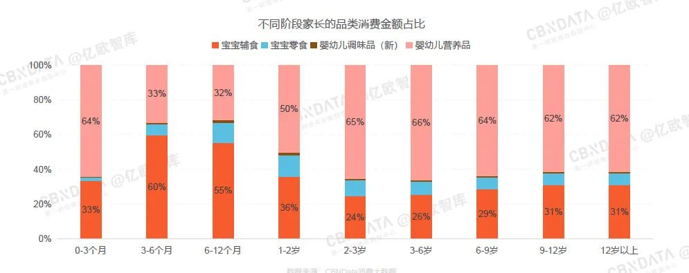 从消费的品种来看,0-3月的宝宝家长主要以营养品消费为主,3-12个月的宝宝家长主要购买宝宝辅食,6个月-2岁宝宝的家长购买零食消费占比相比较于其他年龄段的宝宝家长则较为突出。