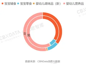 从购买辅食和营养品的家长性别来看,女性购买辅食、零食和调味品占比较男性更高,更倾向于给宝宝提供细致和多样化饮食,而男性消费者在宝宝营养品消费上占比相对更高,对宝宝营养摄入较为关注。