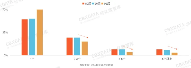 80后、90后妈妈尝试多个品牌的意愿度相对更高,七成95后妈妈每年仅消费一个品牌。80后妈妈消费品牌榜与品类中TOP品牌基本一致,95后妈妈会尝试更多小众品牌。