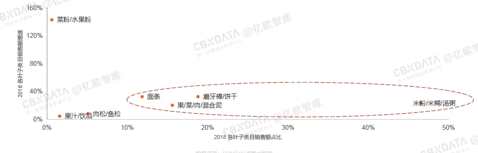 2018年宝宝辅食各类目销售额占比及增速