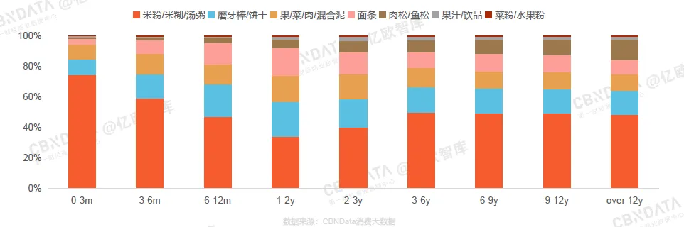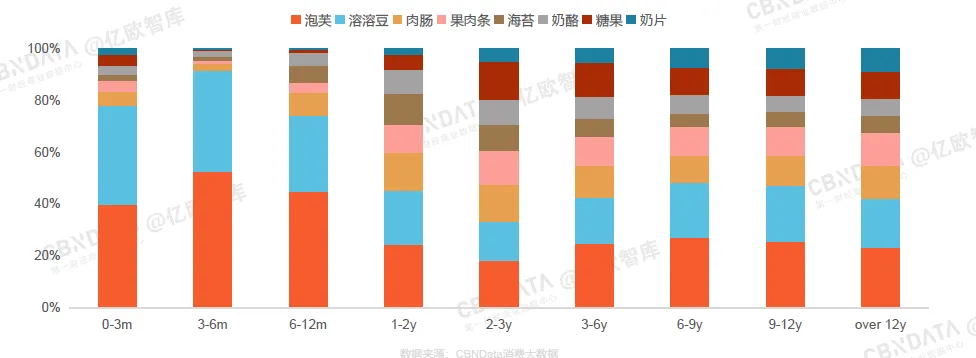 宝宝在6个月大之前,零食主要以泡芙和溶溶豆为主,1岁之后其他零食的比例显著 提高,3岁之后趋于稳定。