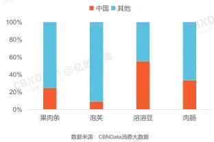 溶溶豆中,国产商品的销售贡献略高于进口商品。但在果肉条、泡芙和肉肠这三类零食中,进口商品销售贡献在6成以上。